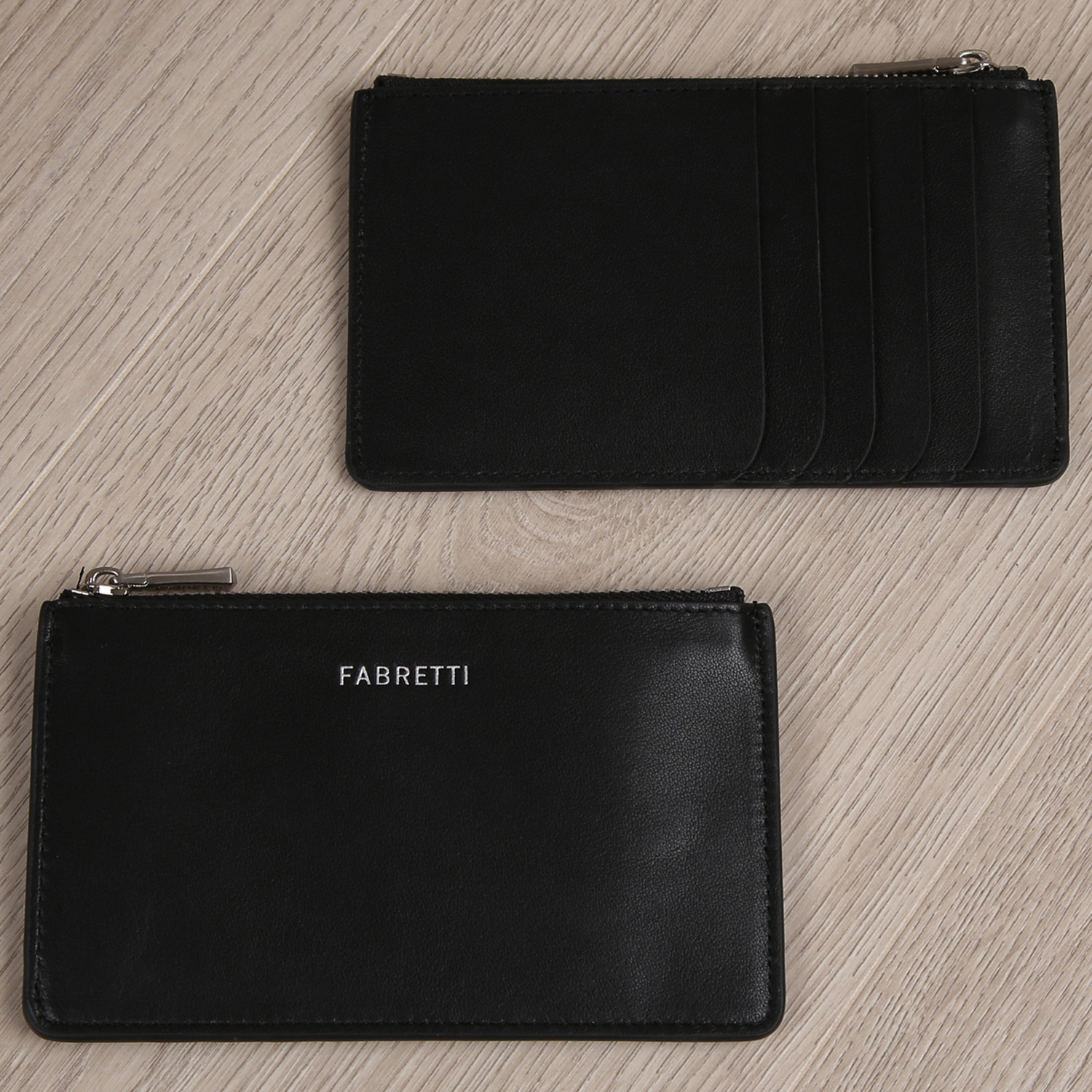 Плоская женская визитница FABRETTI занимает минимум места и незаменима, когда нужно взять несколько банковских карт и какие-то мелочи. Модель выполнена из натуральной гладкой кожи в черном цвете. Удобно размещается в руке, приятна на ощупь.