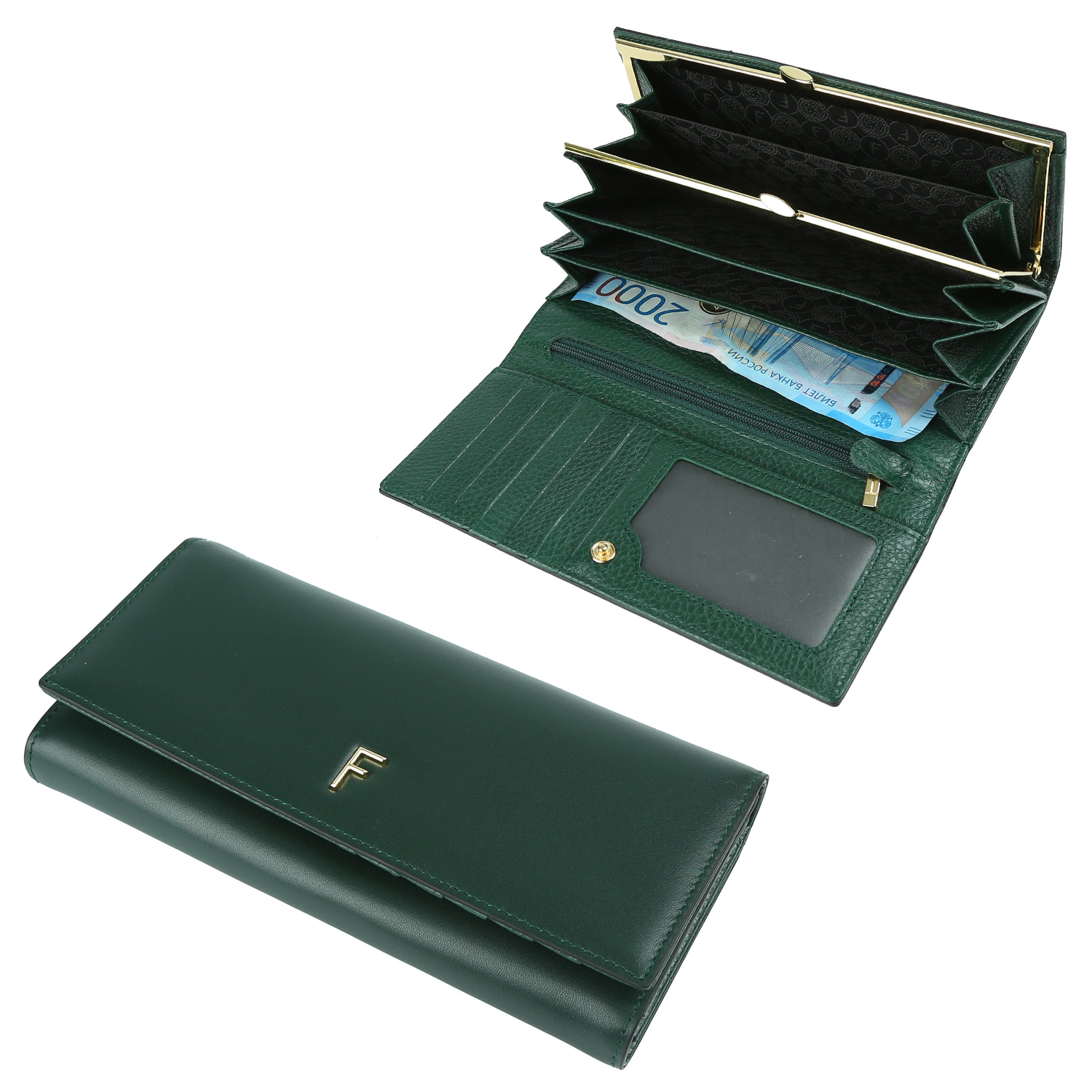 Вместительный женский кошелек FABRETTI в темно-зеленом оттенке выполнен из натуральной кожи гладкой фактуры. Аксессуар закрывается клапаном с кнопкой. Внутри 3 отделения на полную купюру, 2 боковых кармана: открытый и на молнии, 8 слотов для банковских карт, один из которых с прозрачной пленкой для проездного или пропуска. Отделение для мелочи закрывается на рамочный замок. Цвет фурнитуры - золото.