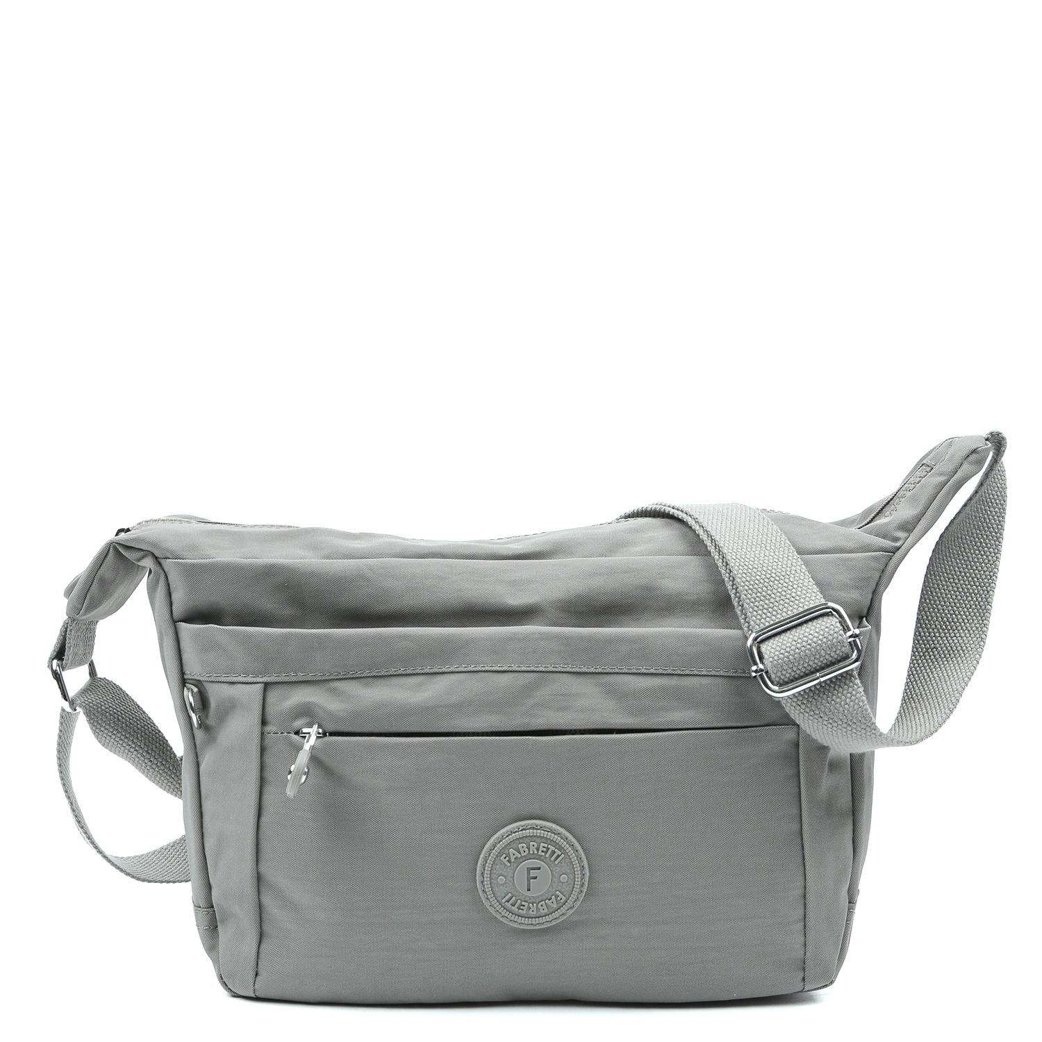 Текстильная сумка FABRETTI в сером оттенке выполнена из высокотехнологичного влагостойкого полиэстера легкой жатой фактуры. Он практичен и прост в уходе. Основное отделение на молнии. Внутри 3 кармана для мелочей: 2 открытых и на молнии. На лицевой стороне расположены 2 кармана на молнии. На тыльной стороне предусмотрен карман быстрого доступа на молнии. Плечевой ремень регулируется по длине, ширина - 3 см.
