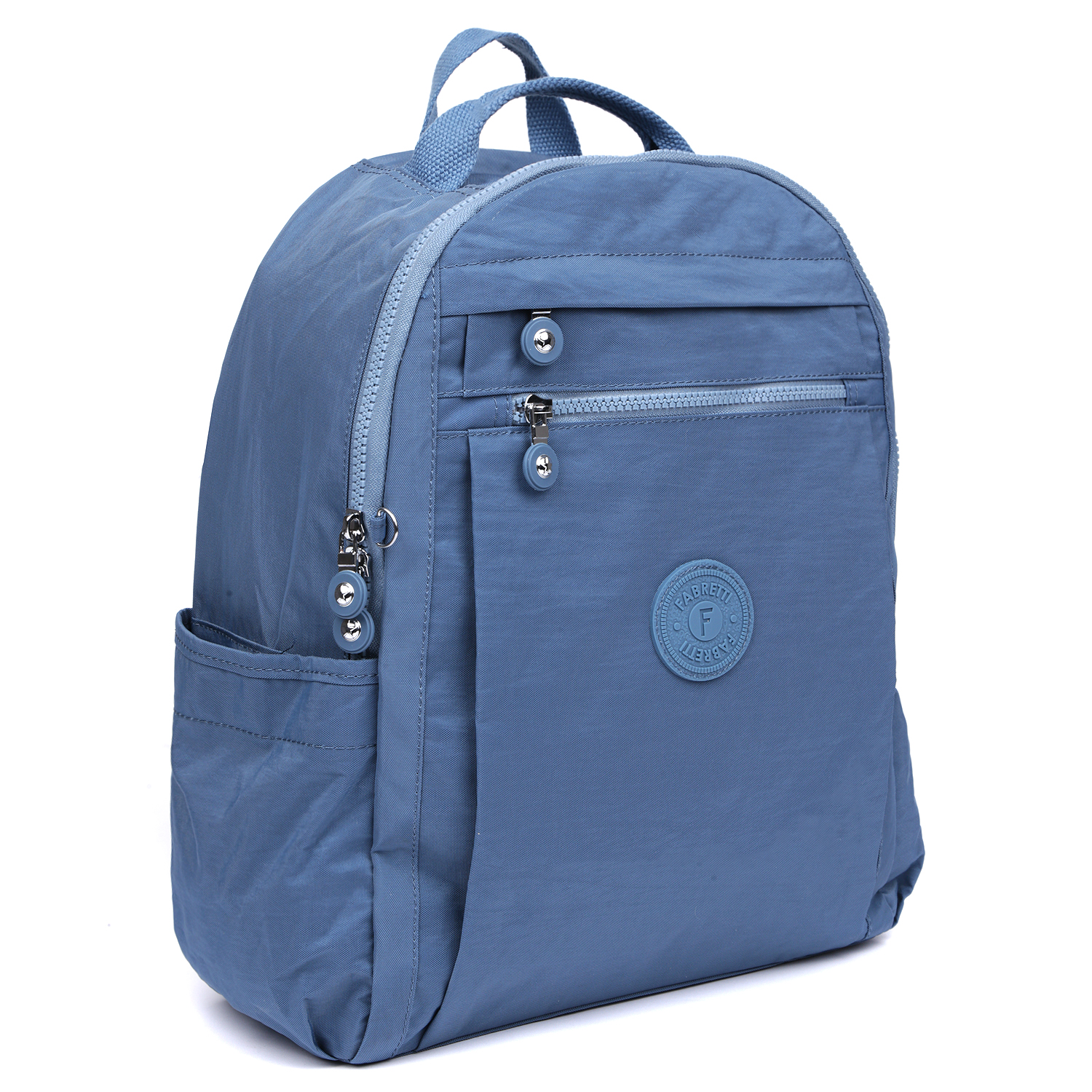 Текстильный рюкзак FABRETTI в голубом цвете идеально подойдет тем, кто предпочитает путешествовать налегке. Он достаточно вместителен, чтобы в него вошла необходимая смена одежды, гигиенические аксессуары, любимая книга, документы и гаджеты. Материал рюкзака устойчив к влаге, за ним удобно ухаживать. На лицевой стороне модели расположены 2 кармана на молнии - глубокий и небольшой. На тыльной стороне есть карман на молнии и специальный рукав для крепления на ручку чемодана. Два кармана на липучке расположены по бокам аксессуара. Основное отделение закрывается на молнию с 2 бегунками. Внутри - 2 кармана для мелочей и боковой отдел для планшета или документов. Для удобства хранения ключей внутри рюкзака есть карабин на шнурке. 2 широкие лямки регулируются по длине. Сверху есть ручка, чтобы носить в руке.