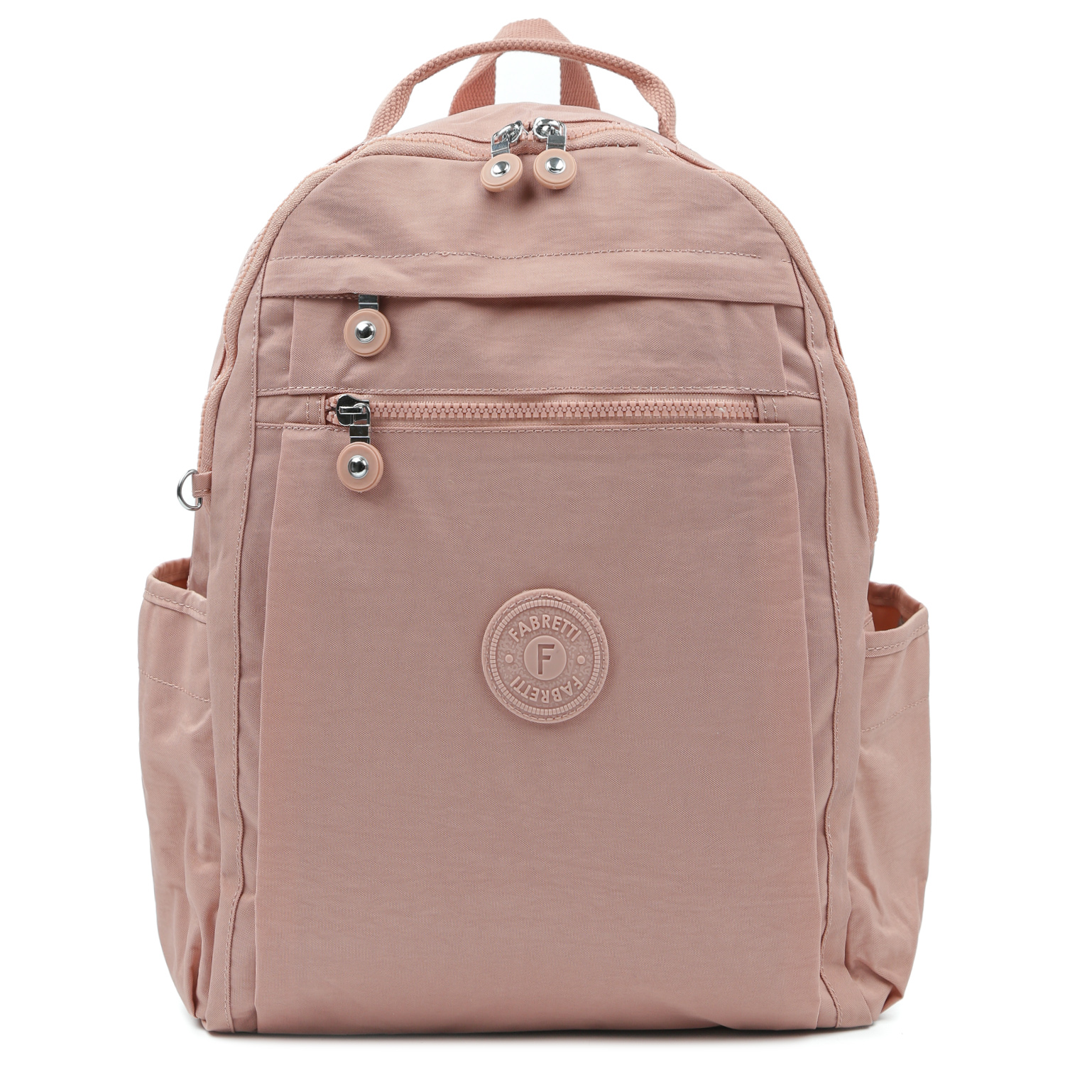 Текстильный рюкзак FABRETTI в розовом оттенке выполнен из высокотехнологичного влагостойкого полиэстера легкой жатой фактуры. Он практичен и прост в уходе. На лицевой стороне расположены 2 кармана на молнии - глубокий и небольшой. На тыльной стороне есть карман на молнии и специальный рукав для крепления на ручку чемодана. Два кармана на липучке расположены по бокам аксессуара. Основное отделение закрывается на молнию с 2 бегунками. Внутри 2 кармана для мелочей и боковой отдел для гаджетов или документов. Для удобства хранения ключей внутри рюкзака есть карабин на шнурке. 2 широкие лямки регулируются по длине (ширина - 6,5 см). Сверху есть ручка, чтобы носить в руке.