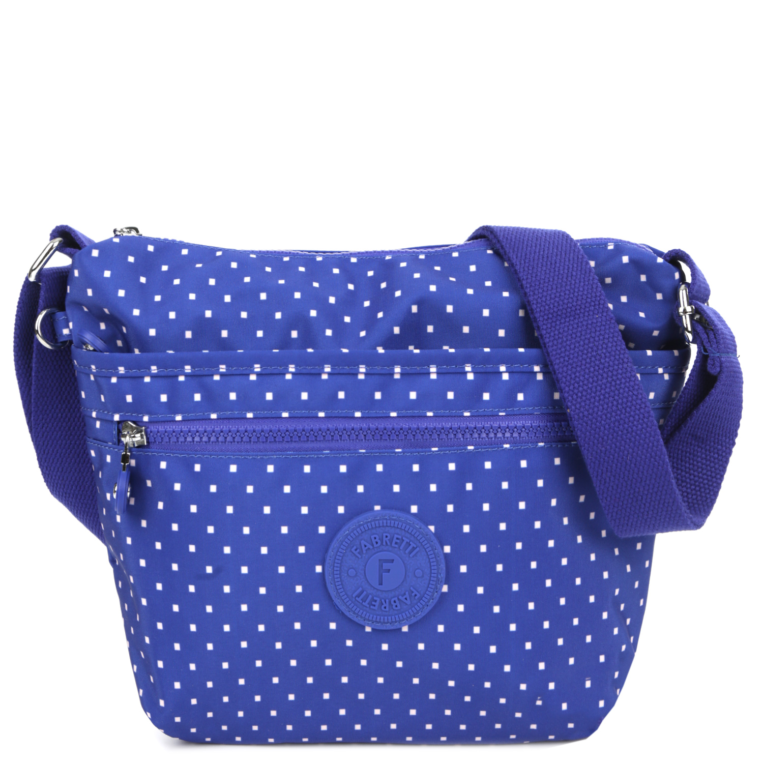 Текстильная сумка кросс-боди FABRETTI в синем оттенке выполнена из высокотехнологичного влагостойкого полиэстера. Он практичен и прост в уходе. В качестве декора выбран принт в виде повторяющихся маленьких прямоугольников, издалека создающих визуальный эффект мелкого гороха. Основное отделение закрывается на молнию с удобным поводком. Внутри есть 3 боковых кармана для мелочей: 2 открытых и на молнии. Карабин на шнурке поможет быстро найти ключи в сумке. На лицевой стороне расположены 2 вместительных кармана на молнии. На тыльной стороне предусмотрен вместительный карман быстрого доступа на молнии. Текстильный плечевой ремень регулируется по длине, ширина - 3 см.