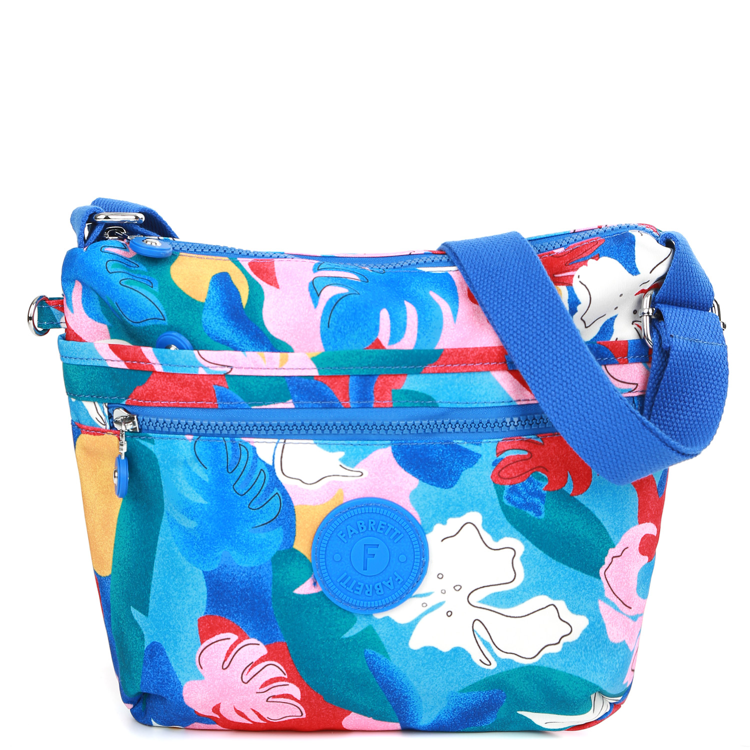 Текстильная сумка кросс-боди FABRETTI в голубом оттенке выполнена из высокотехнологичного влагостойкого полиэстера. Он практичен и прост в уходе. В качестве декора выбран абстрактный принт. Основное отделение закрывается на молнию с удобным поводком. Внутри есть 3 боковых кармана для мелочей: 2 открытых и на молнии. Карабин на шнурке поможет быстро найти ключи в сумке. На лицевой стороне расположены 2 вместительных кармана на молнии. На тыльной стороне предусмотрен вместительный карман быстрого доступа на молнии. Текстильный плечевой ремень регулируется по длине, ширина - 3 см.