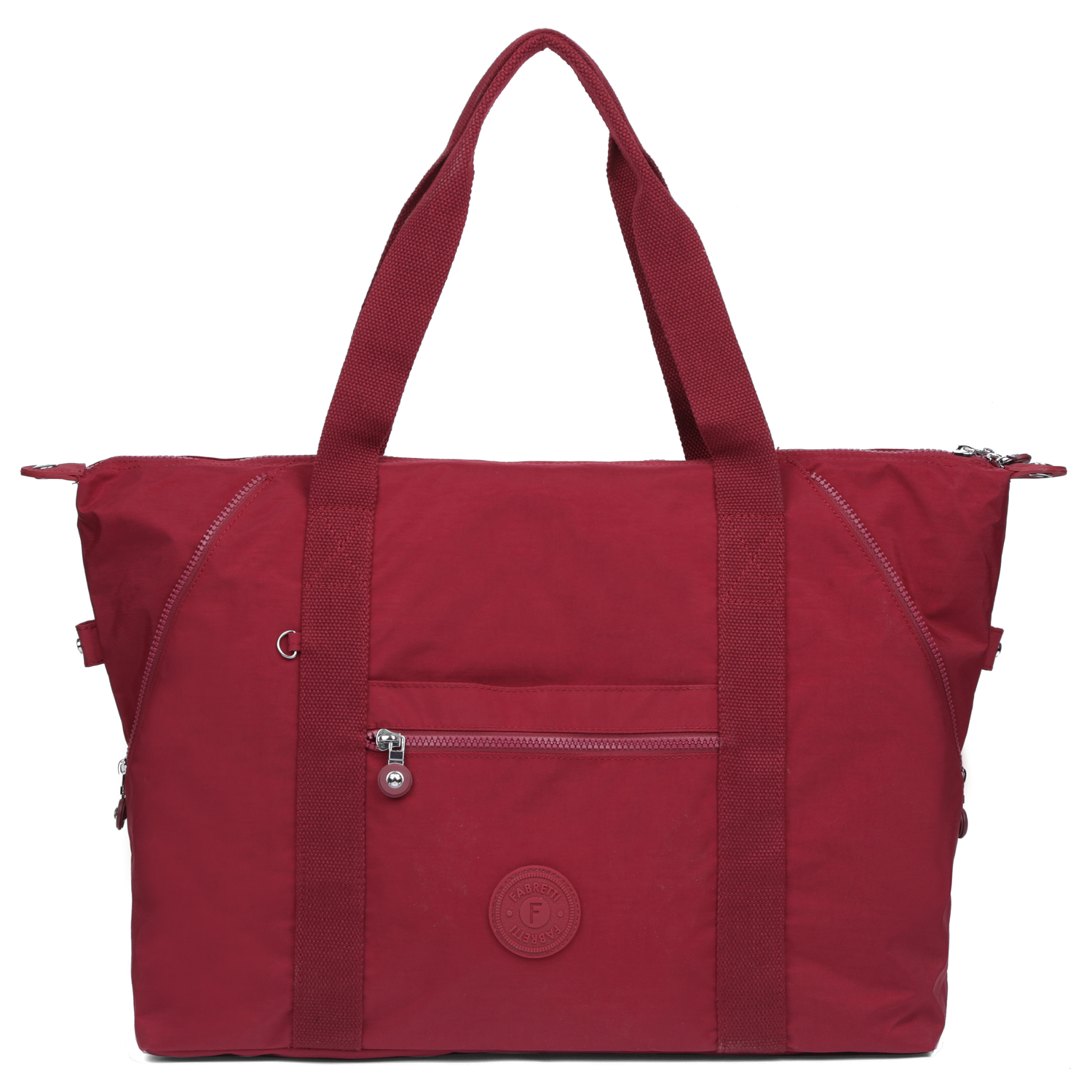 Текстильная сумка FABRETTI в бордовом цвете выполнена из высокотехнологичного влагостойкого полиэстера. Он практичен и прост в уходе. Основное отделение закрывается на молнию с 2 удобными поводками. Внутри 3 боковых кармана: 2 открытых и на молнии. На лицевой стороне предусмотрены 2 кармана: открытый и на молнии. На тыльной стороне расположен специальный рукав для крепления на ручку чемодана. На боковых сторонах модели расположены дополнительные молнии, которые при необходимости можно расстегнуть и увеличить внутренний объем сумки. У сумки есть две ручки средней длины, благодаря чему аксессуар удобно носить в руке или на плече.