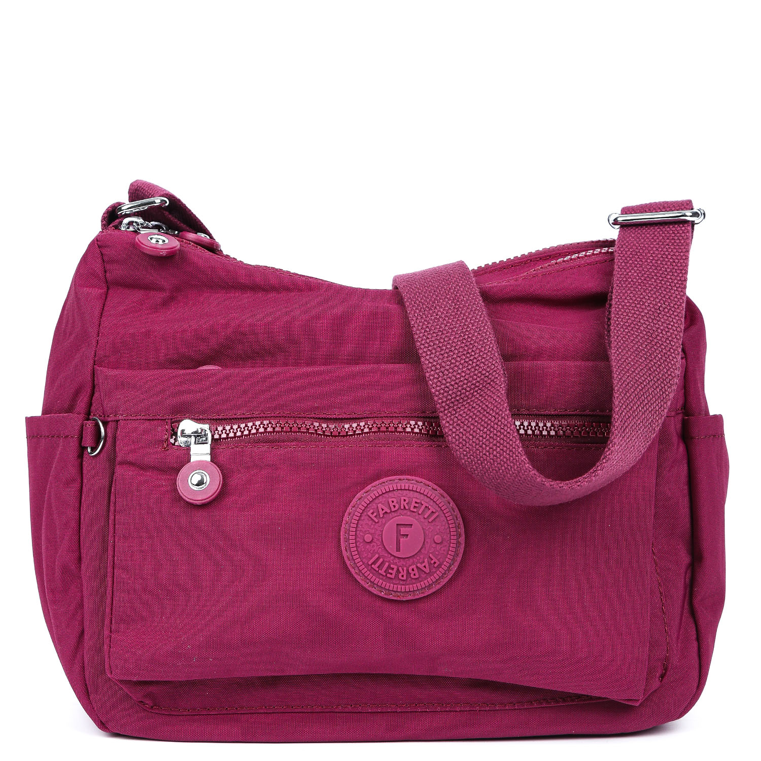 Текстильная сумка FABRETTI в бордовом оттенке выполнена из высокотехнологичного влагостойкого полиэстера легкой жатой фактуры. Модель имеет 2 отделения. В одном из них расположены 2 открытых боковых кармана. Во втором отделении есть карабин и боковой карман на молнии. На лицевой стороне находятся 2 кармана быстрого доступа и ещё один - на тыльной стороне. На боковых сторонах предусмотрены 2 открытых кармана. Текстильный плечевой ремень регулируется по длине, ширина - 3 см.