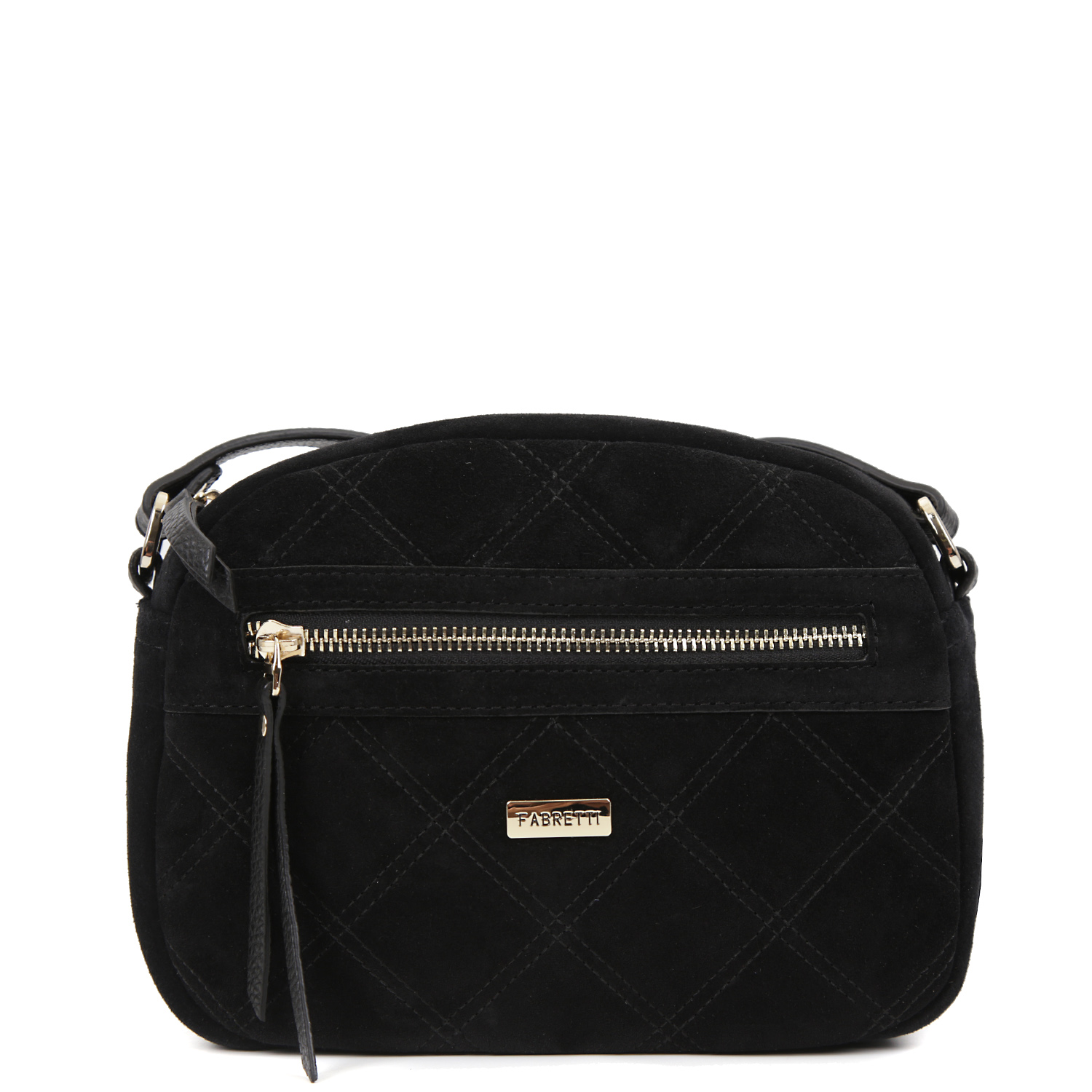 Компактная кросс-боди FABRETTI в черном цвете сочетает натуральную кожу зернистой фактуры и замшу. На лицевой стороне расположен карман быстрого доступа. В качестве декора выбраны ромбовидная стежка и миниатюрный шильдик с названием бренда. Основное отделение закрывается на полукруглую молнию с кожаным поводком. Внутри 2 боковых кармана для мелочей: открытый и на молнии. На тыльной стороне предусмотрен карман быстрого доступа на молнии. Изящный плечевой ремень регулируется по длине. Его ширина - 2 см. Цвет фурнитуры - золото.