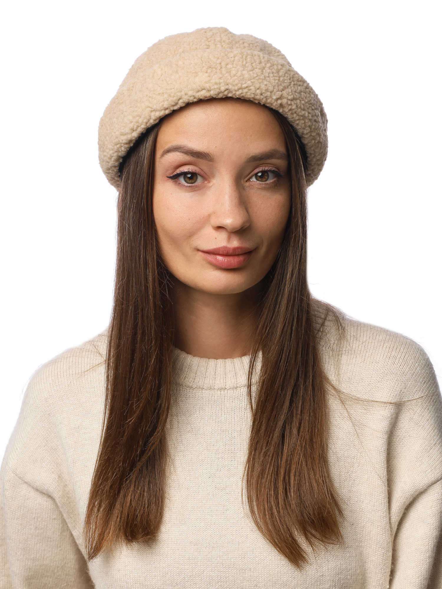 Интересная женская шапка-докер FABRETTI нежного бежевого цвета изготовлена из экомеха с текстурой «под овечью шерсть». Крой шапки классический шестиклинный, с широким отворотом.