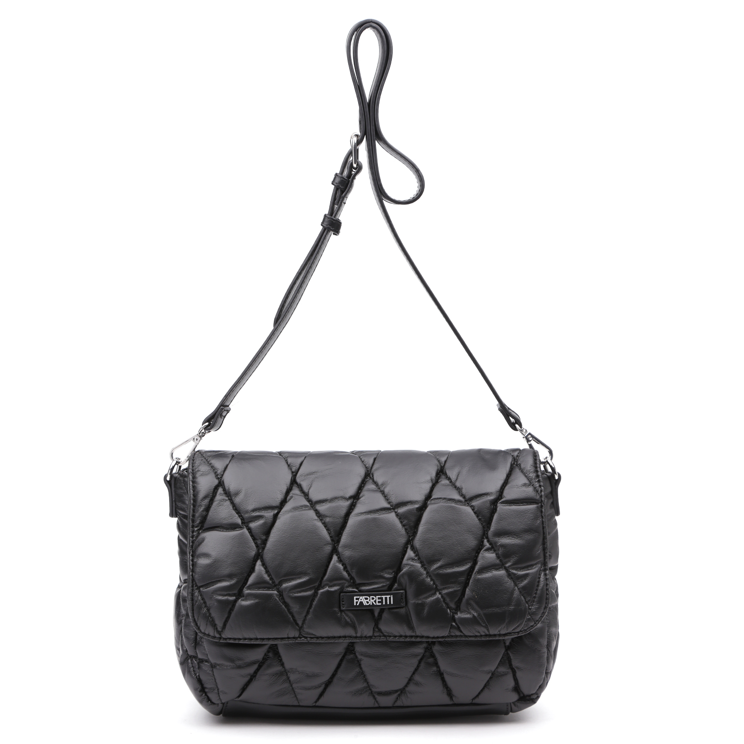Стеганая сумка на плечо FABRETTI в черном цвете станет оригинальной деталью в образе. Модель выполнена из современного материала, который устойчив к воздействию влаги и перепаду температур. В качестве декора выступает ромбовидная стёжка. Сумка закрывается клапаном на магнитной кнопке. Основное отделение - на молнии. Внутри 2 боковых кармана для мелочей: открытый и на молнии. Дополняет дизайн съемный плечевой ремень, длина которого регулируется. Цвет фурнитуры - серебро.