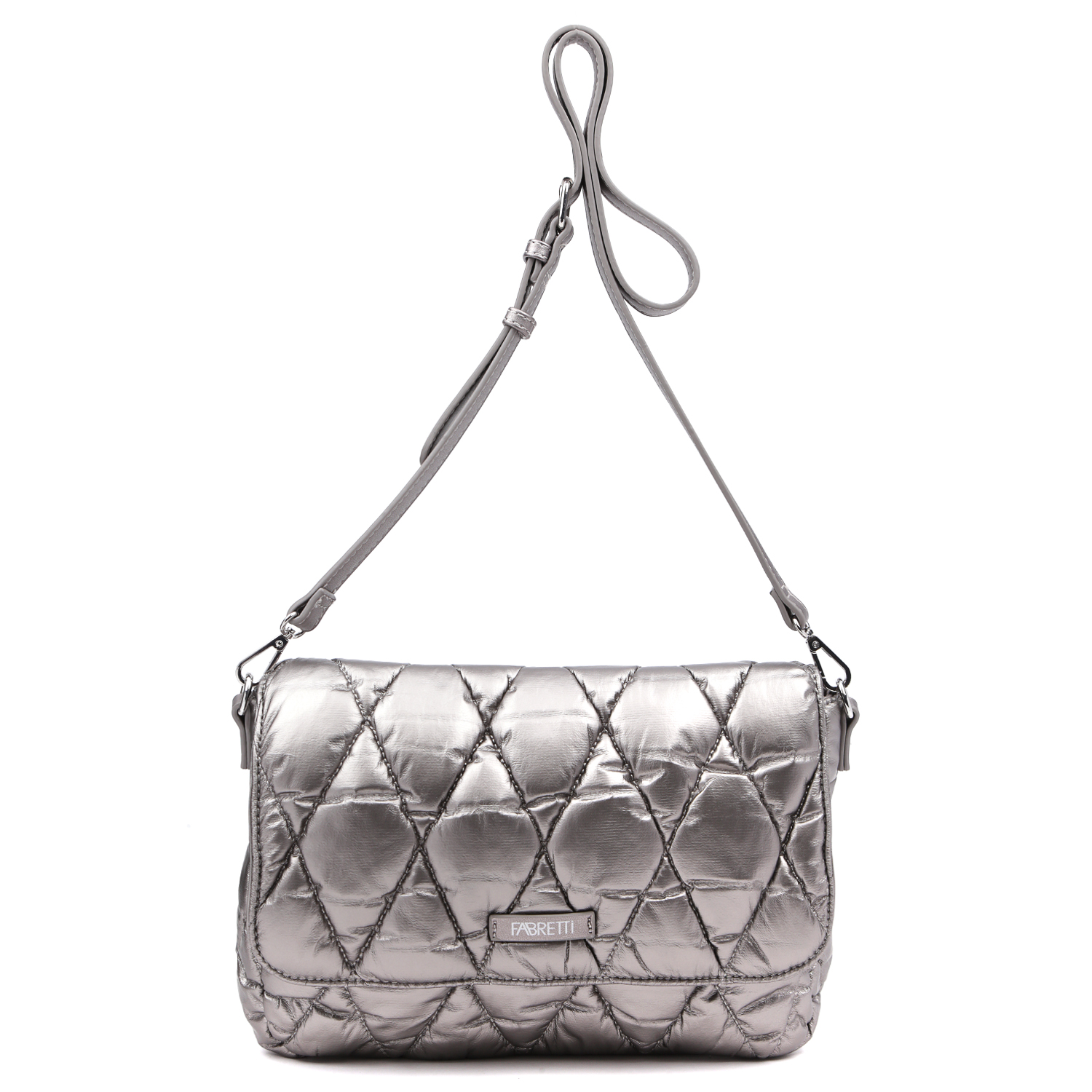 Стеганая сумка на плечо FABRETTI в оттенке серый металлик станет оригинальной деталью в образе. Модель выполнена из современного материала, который устойчив к воздействию влаги и перепаду температур. В качестве декора выступает ромбовидная стёжка. Сумка закрывается клапаном на магнитной кнопке. Основное отделение - на молнии. Внутри 2 боковых кармана для мелочей: открытый и на молнии. Дополняет дизайн съемный плечевой ремень, длина которого регулируется. Цвет фурнитуры - серебро.