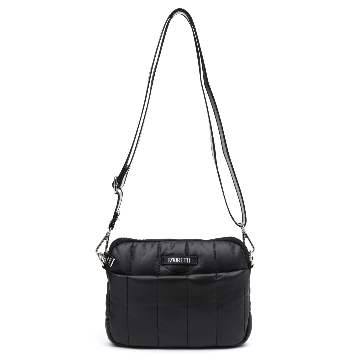 Компактная стеганая кросс-боди FABRETTI выполнена из экокожи в черном цвете. Высокотехнологичный материал на полиуретановой основе обладает водоотталкивающими свойствами, устойчив к температурным перепадам до -25 C, приятен на ощупь. Основное отделение закрывается на полукруглую молнию. Внутри есть боковой карман для мелочей на молнии. Съемный широкий ремень из текстиля гармонично дополняет дизайн изделия. Цвет фурнитуры – серебро.
