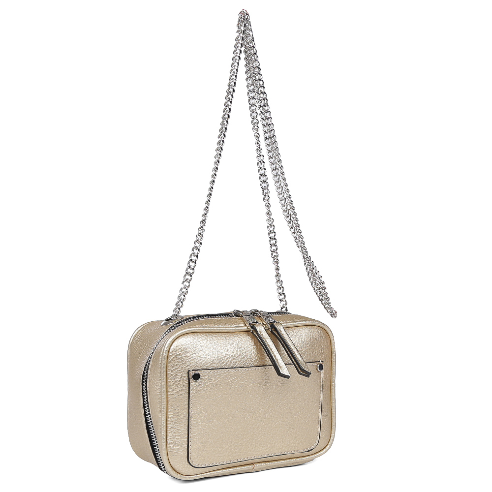 Стильная женская сумка кросс-боди Fabretti выполнена из высококачественной металлизированной экокожи, которая держит форму и имеет мягкую и приятную на ощупь фактуру. Стильный золотой оттенок, контрастная строчка и длинные кожаные поводки - все это поможет дополнить и завершить Ваш изысканный и роскошный образ. Кросс-боди имеет одно вместительное отделение, которое закрывается на прочную молнию. Внутри сумки вы с легкостью сможете расположить свой сотовый телефон и другие женские мелочи с помощью удобного кармана на молнии. Модель очень компактна и не вмещает формат A4. Дополните ваш look изысканный шелковым платком или солнцезащитными очками из наших коллекций и спешите получать комплименты от ваших знакомых!