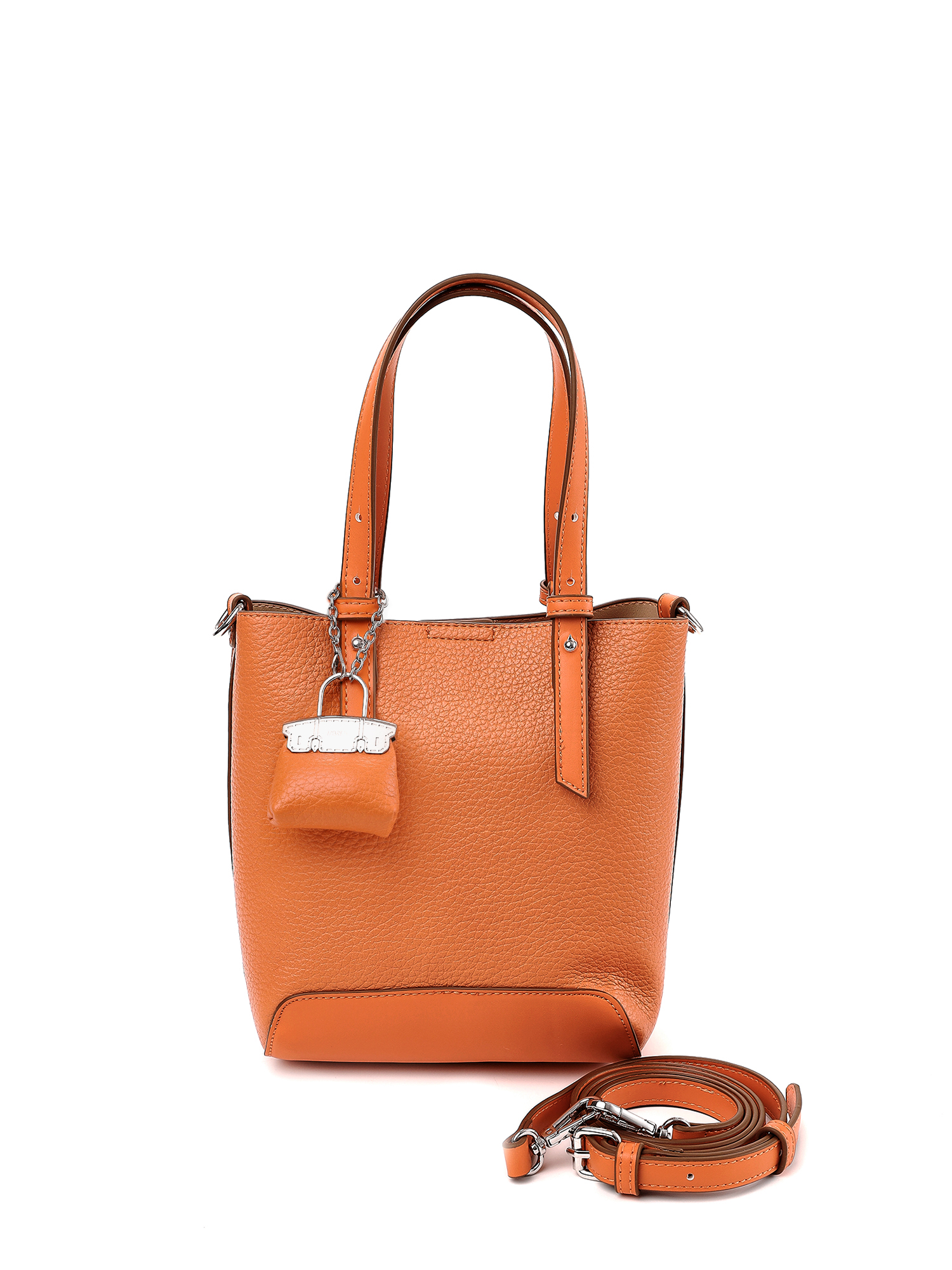 Короткие ручки из жесткой экокожи регулируются по высоте. Съемный ремень на карабинах регулируется по длине пряжкой. Модель дополнена небольшим съемным брелоком в виде сумочки.