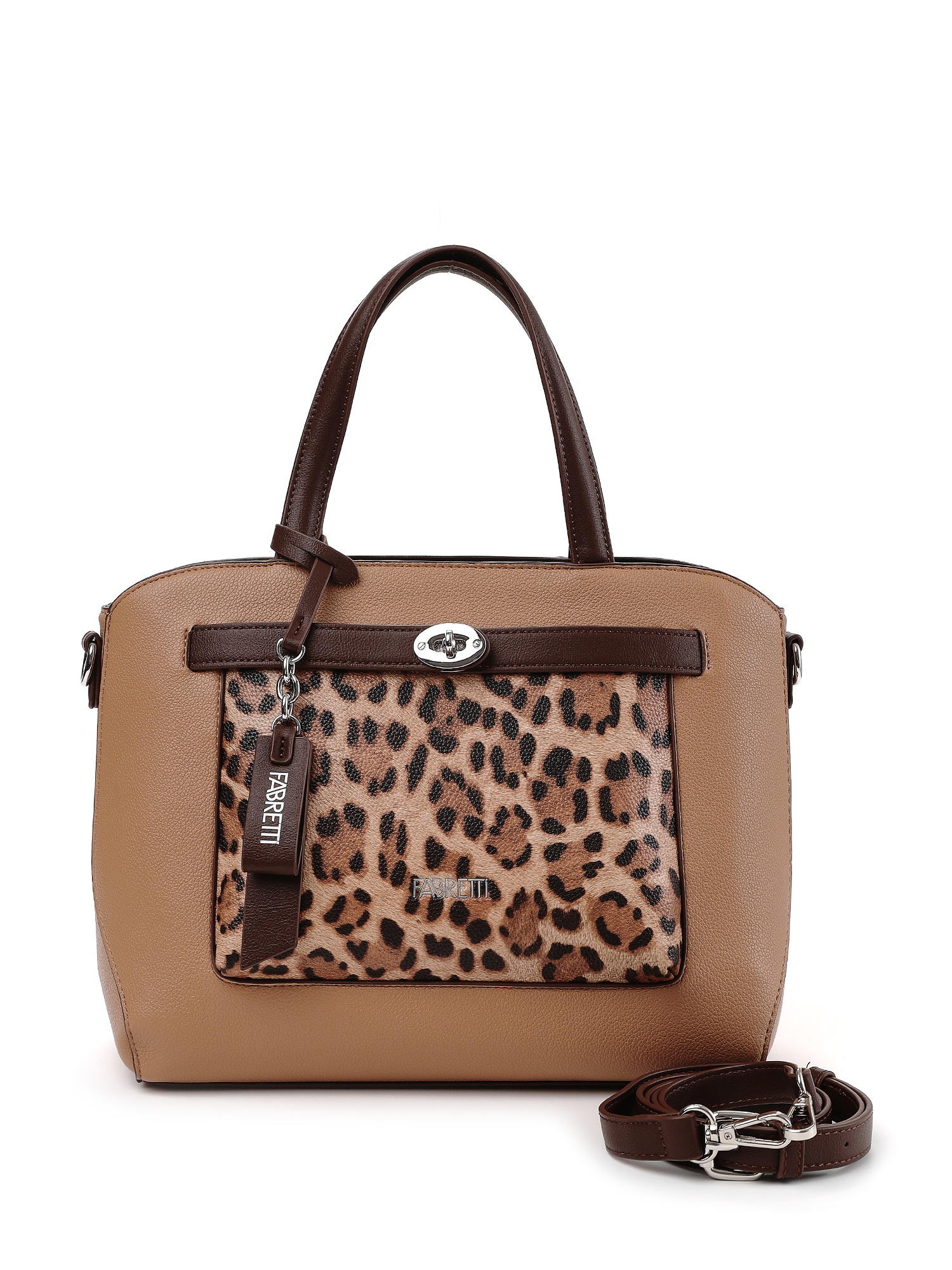 Объемная женская сумка тоут итальянского бренда FABRETTI с эффектным анималистичным декором. Сумка выполнена из высококачественной экокожи с зернистой фактурой теплого кофейно-бежевого оттенка, лицевая сторона дополнена открытым карманом с актуальным «леопардовым» принтом и декоративным хлястиком с поворотным замком.