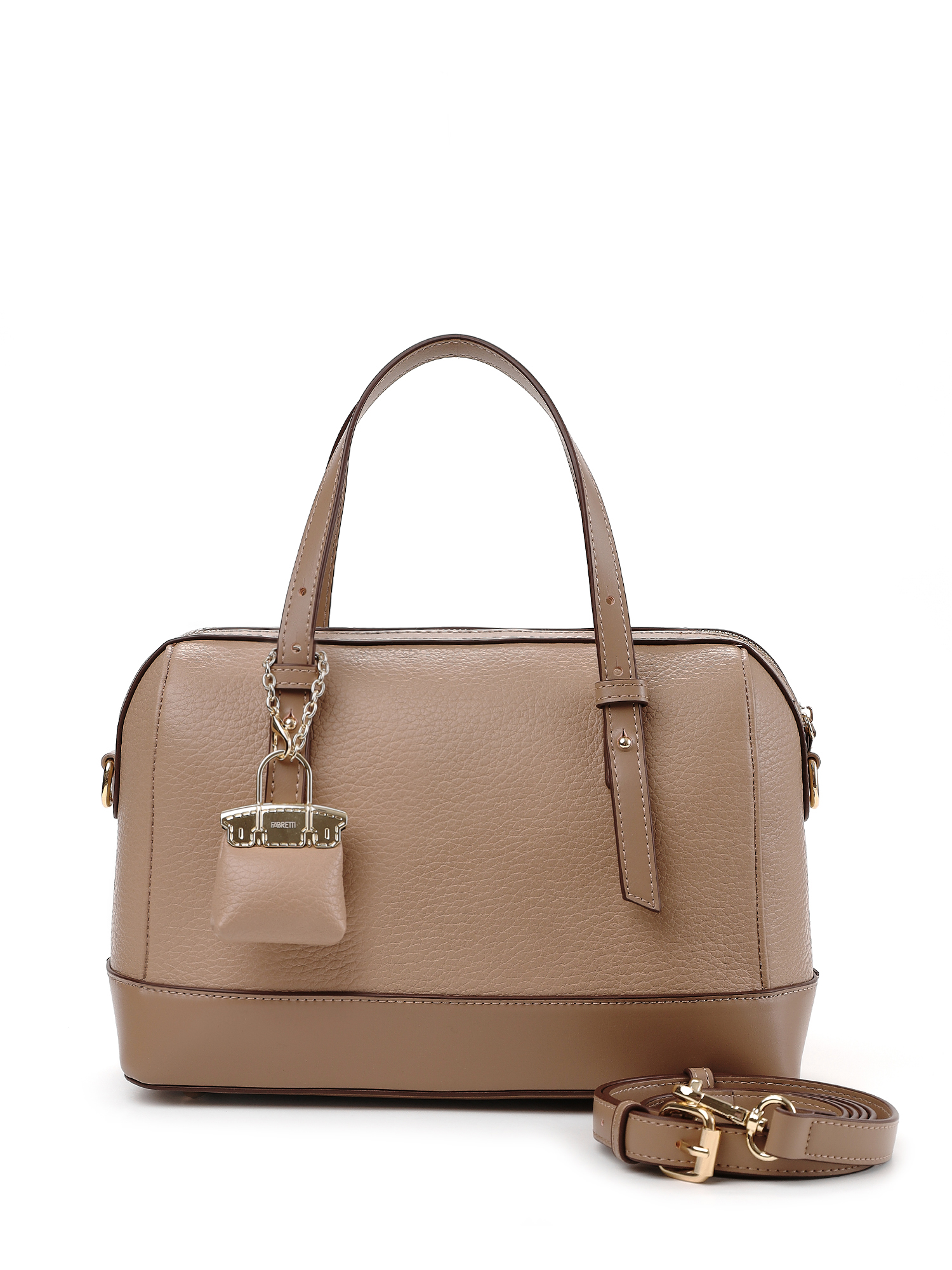 Короткие ручки из жесткой экокожи регулируются по высоте. Съемный ремень на карабинах регулируется по длине пряжкой. Модель дополнена небольшим съемным брелоком в виде сумочки.