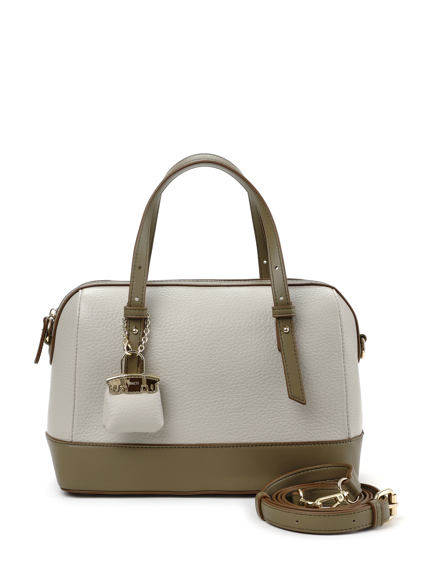 Стильная и лаконичная женская городская сумка боулер из коллекции итальянского бренда FABRETTI выполнена из плотной экокожи двух фактур – светло-бежевой крупнозернистой и серо-зеленой гладкой. Жесткий каркас прекрасно держит форму, защищая ваши вещи. Углы сумки плавные, что сглаживает изначальную строгость силуэта.