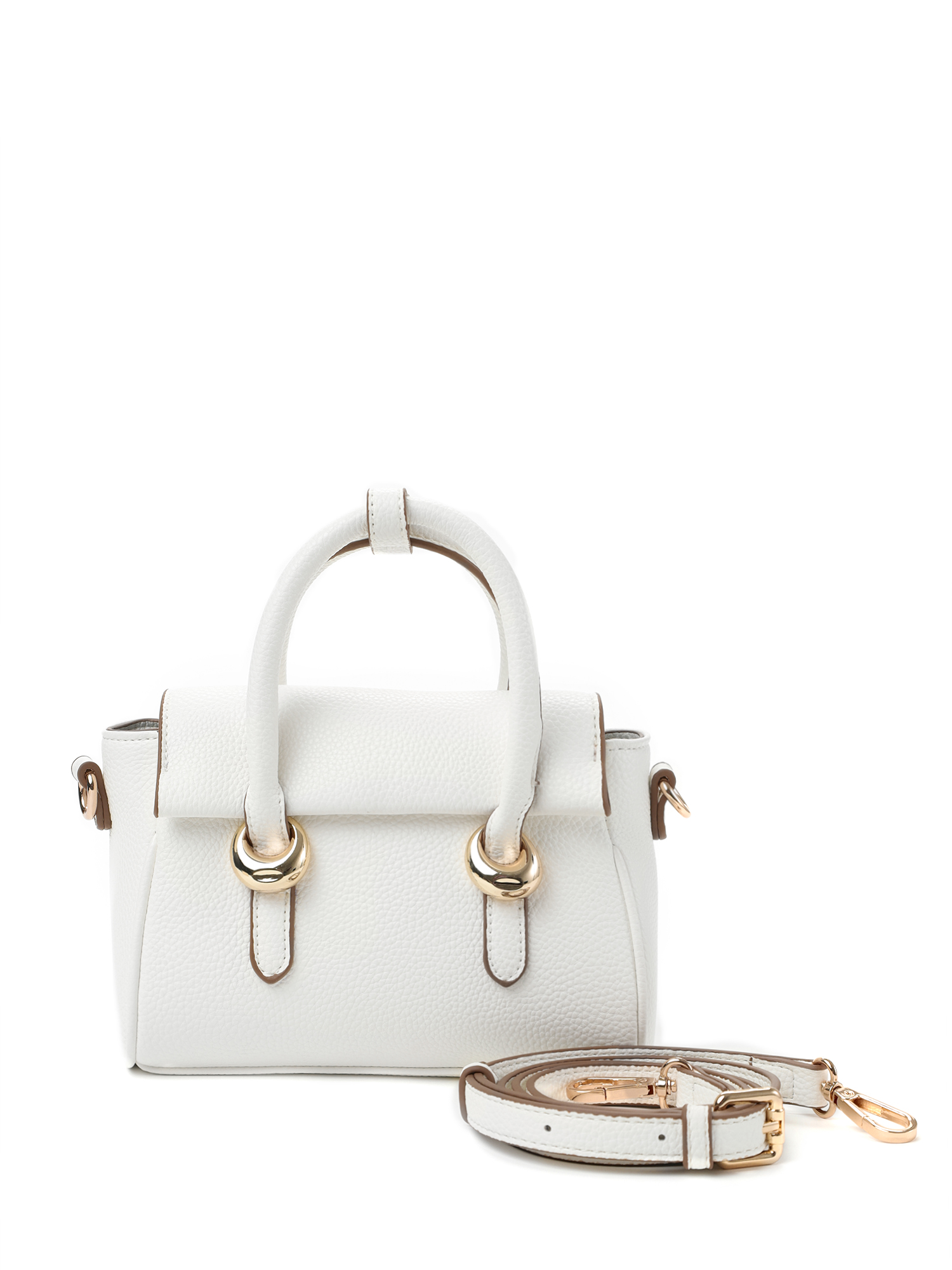 Миниатюрная женская сумка сэтчел итальянского бренда FABRETTI из нежной экокожи с мелкозернистой фактурой в чистом белом цвете со светло-коричневой отделкой швов. Классическая маленькая прямоугольная сумочка с клапаном на магнитной кнопке – идеальный городской аксессуар, вместительный, но компактный и хорошо сохраняющий геометрию формы.
