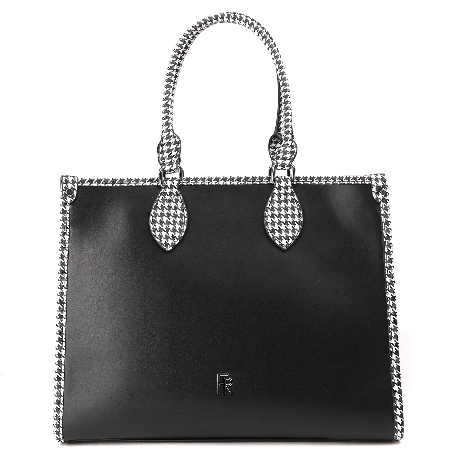 Вместительная сумка-тоут FABRETTI в черном цвете выполнена из экокожи гладкой фактуры и декорирована принтом «гусиная лапка». Сумка прекрасно держит форму. Просторное отделение на молнии. Внутри 3 боковых кармана для мелочей: 2 открытых и на молнии. На тыльной стороне предусмотрен карман быстрого доступа. Дно сумки защищают от повреждений 4 металлические ножки. Две плотные ручки позволяют комфортно носить аксессуар в руке или на плече. В комплекте идет съемный плечевой ремень, регулируемый по длине, ширина - 4 см. Модель вмещает формат А4. Цвет фурнитуры - серебро.