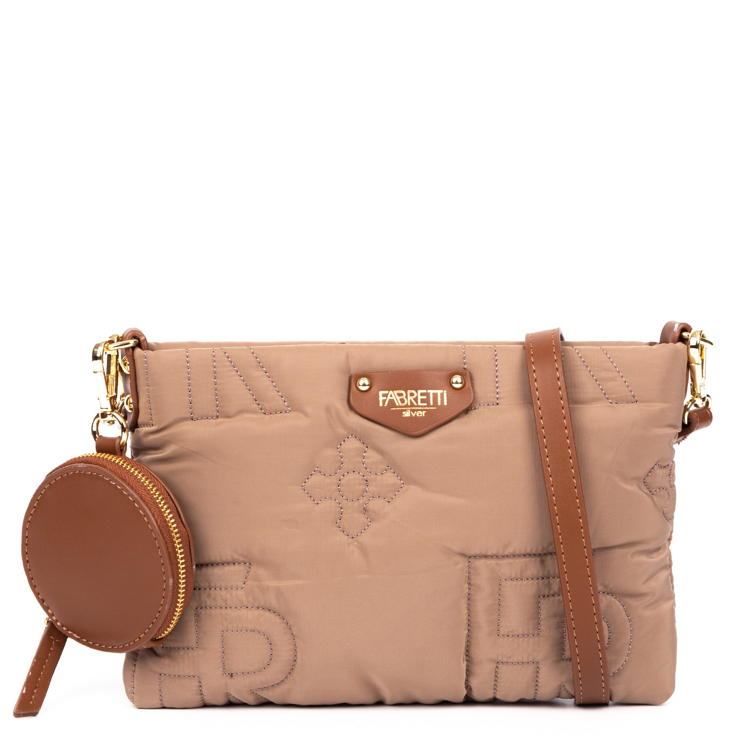 Компактная кросс-боди с монетницей FABRETTI выполнена из технологичного влагостойкого полиэстера в бежевом оттенке и декорирована стёжкой в стиле «Логомания». Плечевой ремень, монетница и элементы отделки выполнены из экокожи в коричневом оттенке. Сумка закрывается на молнию. Внутри 2 боковых кармана для мелочей: открытый и на молнии. Съемный плечевой ремень (ширина - 1,5 см) регулируется по длине. При желании его можно снять и кросс-боди станет оригинальным клатчем. Сумка дополнена круглой монетницей, которая крепится к аксессуару с помощью карабина, размер 8*8*1,5 см. Цвет фурнитуры - золото.