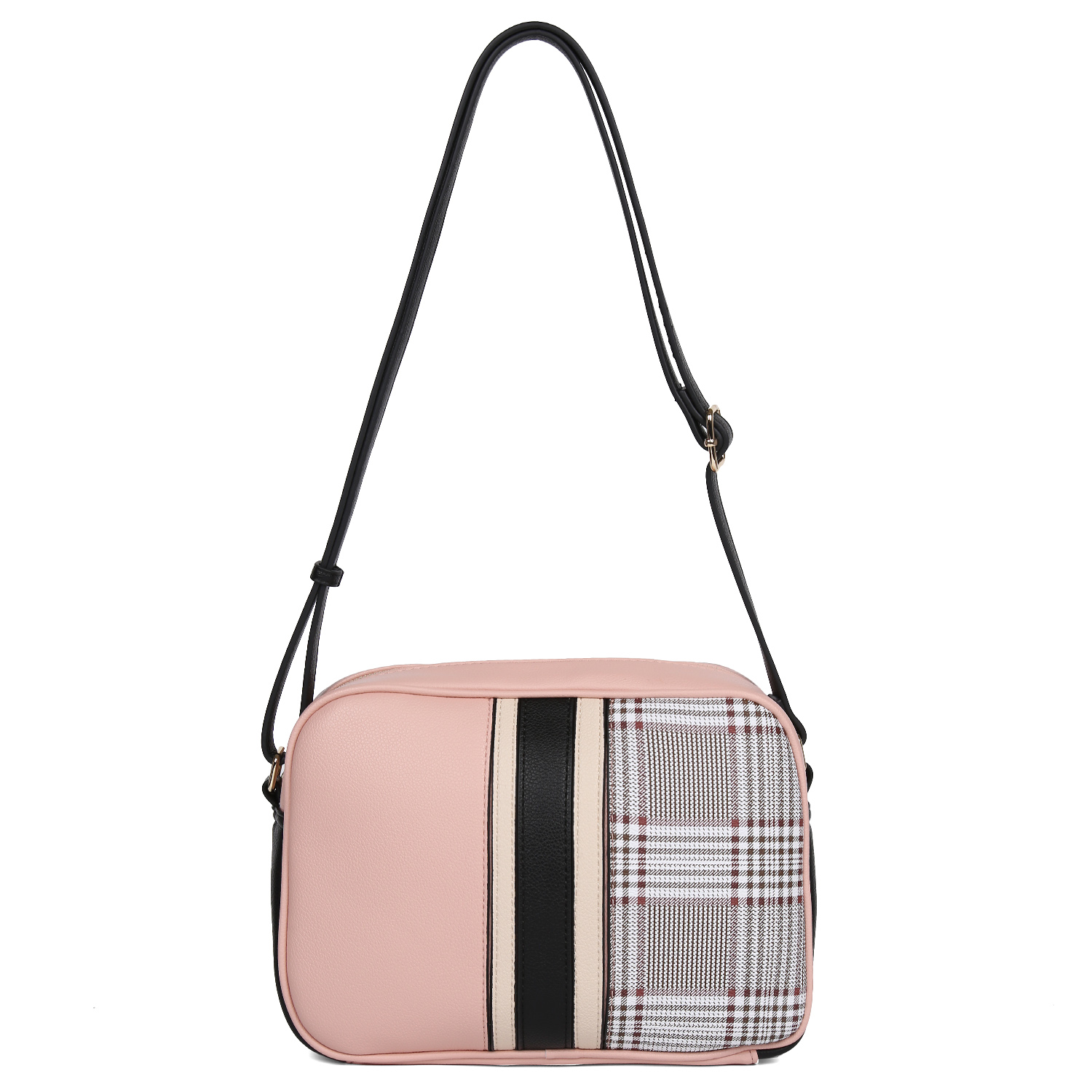 Оригинальная сумка кросс-боди FABRETTI выполнена из экокожи в розово-бежевых оттенках и отличается эффектным дизайном в стиле 80-х годов. В декоре использована комбинация цветовых блоков и вставок с принтом «клетка».