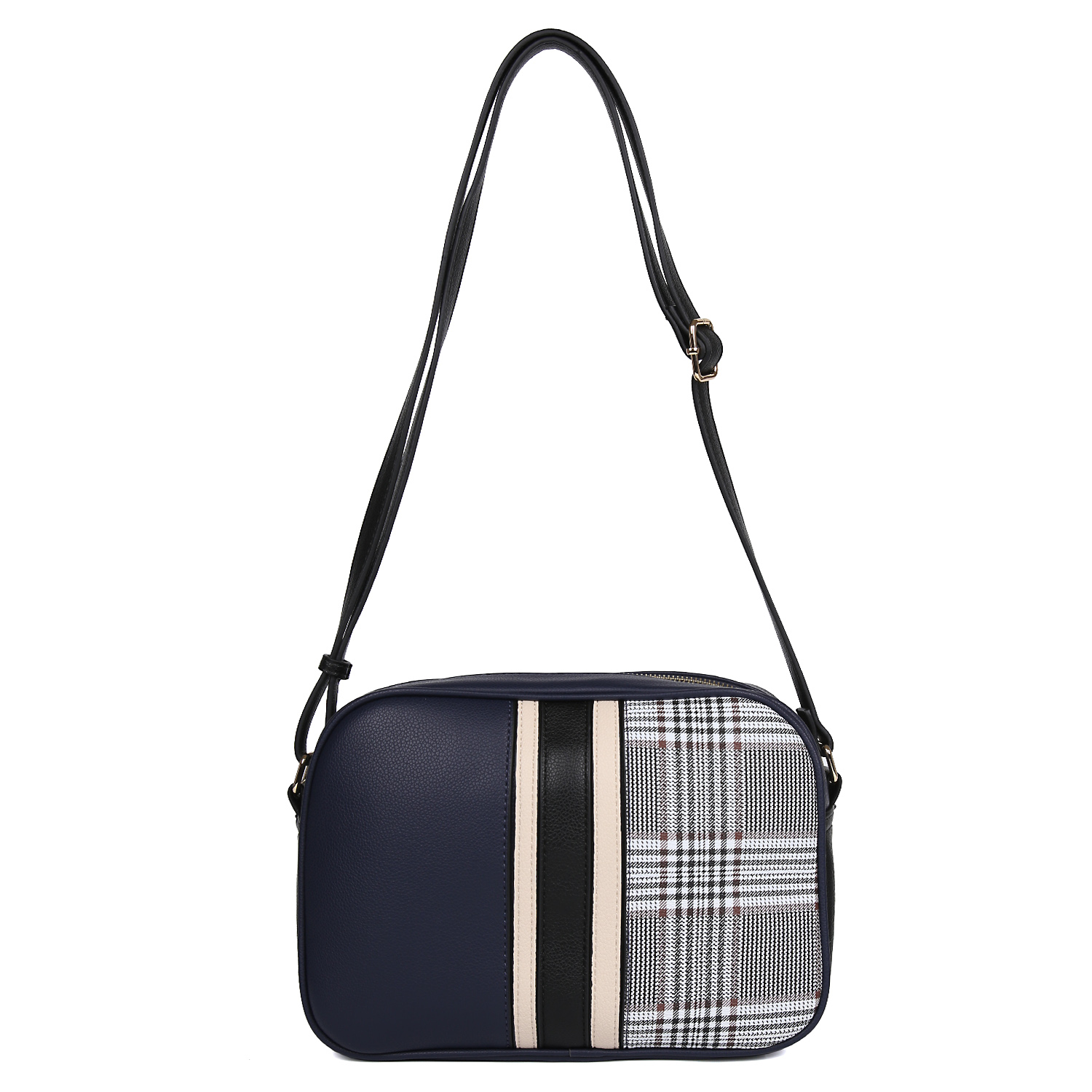 Оригинальная сумка кросс-боди FABRETTI выполнена из экокожи в темно-синих оттенках и отличается эффектным дизайном в стиле 80-х годов. В декоре использована комбинация цветовых блоков и вставок с принтом «клетка».