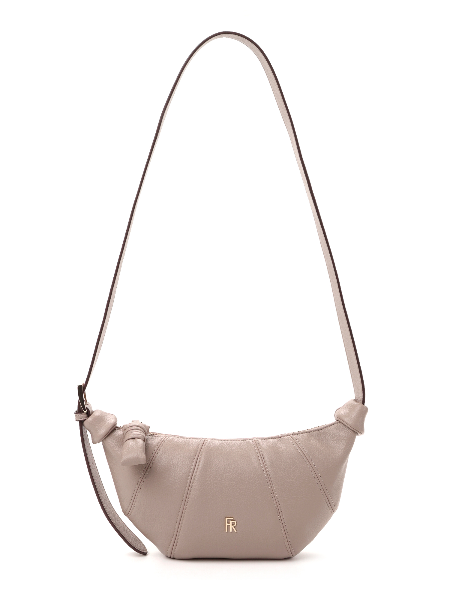 Маленькая трендовая женская сумка круассан итальянского бренда FABRETTI из нежной экокожи с зернистой фактурой. Она выполнена в нежном розовато-бежевом «нюдовом» цвете со светло-коричневым кантом на ремне.