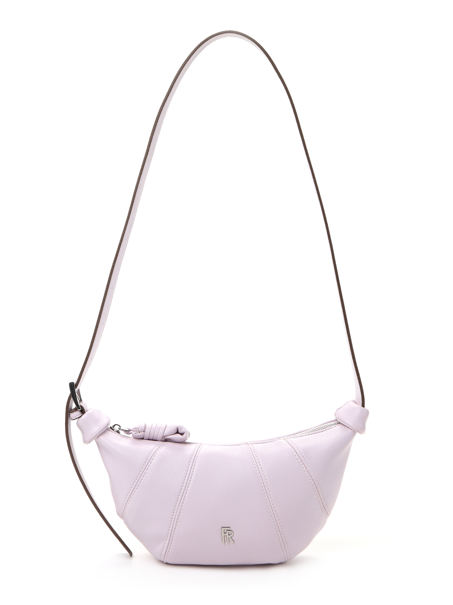 Маленькая трендовая женская сумка круассан итальянского бренда FABRETTI из нежной экокожи с зернистой фактурой. Она выполнена в легком лилово-розовом оттенке с коричневым кантом на ремне.