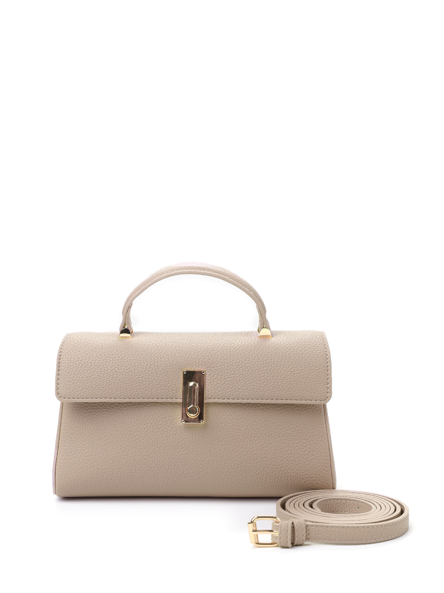 Миниатюрная женская сумка сэтчел итальянского бренда FABRETTI из экокожи с зернистой фактурой в нежном кофейно-бежевом цвете. Оригинальная прямоугольная сумочка с клапаном на поворотном замке – идеальный городской аксессуар, который жестко держит форму, но вмещает все необходимые мелочи.