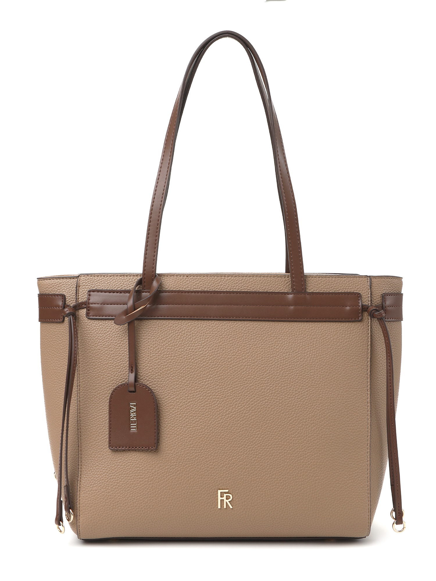 Большая женская сумка тоут итальянского бренда FABRETTI выполнена из высококачественной экокожи с крупнозернистой фактурой. Модель решена в классической цветовой схеме: светлая коричнево-бежевая экокожа с рельефом дополнена темной коричневой отделкой из гладкой экокожи. Такой вариант смотрится респектабельно, хорошо сочетается с городским и деловым стилем, выглядит эффектно, но не перегружен деталями. У модели форма трапеции, длинные ручки для ношения на плече.