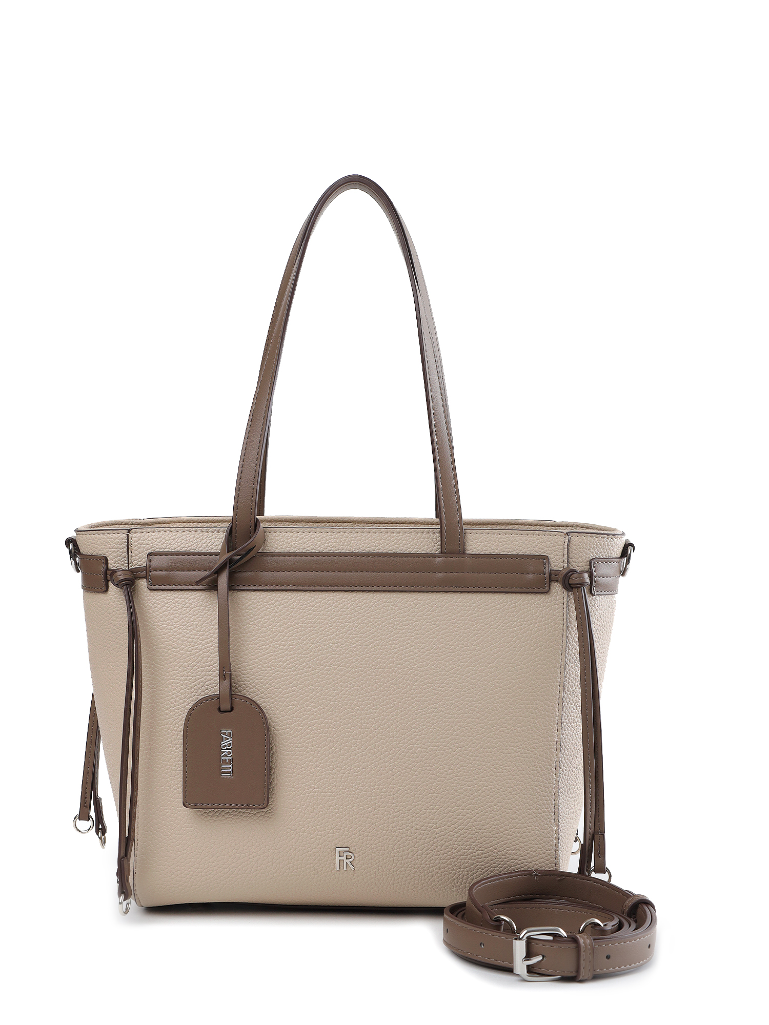 Классическая женская сумка тоут итальянского бренда FABRETTI выполнена из высококачественной экокожи с крупнозернистой фактурой. Модель решена в классической цветовой схеме: светлая серо-бежевая экокожа с рельефом дополнена темной серо-коричневой отделкой из гладкой экокожи. Такой вариант смотрится респектабельно, хорошо сочетается с городским и деловым стилем, выглядит эффектно, но не перегружен деталями.