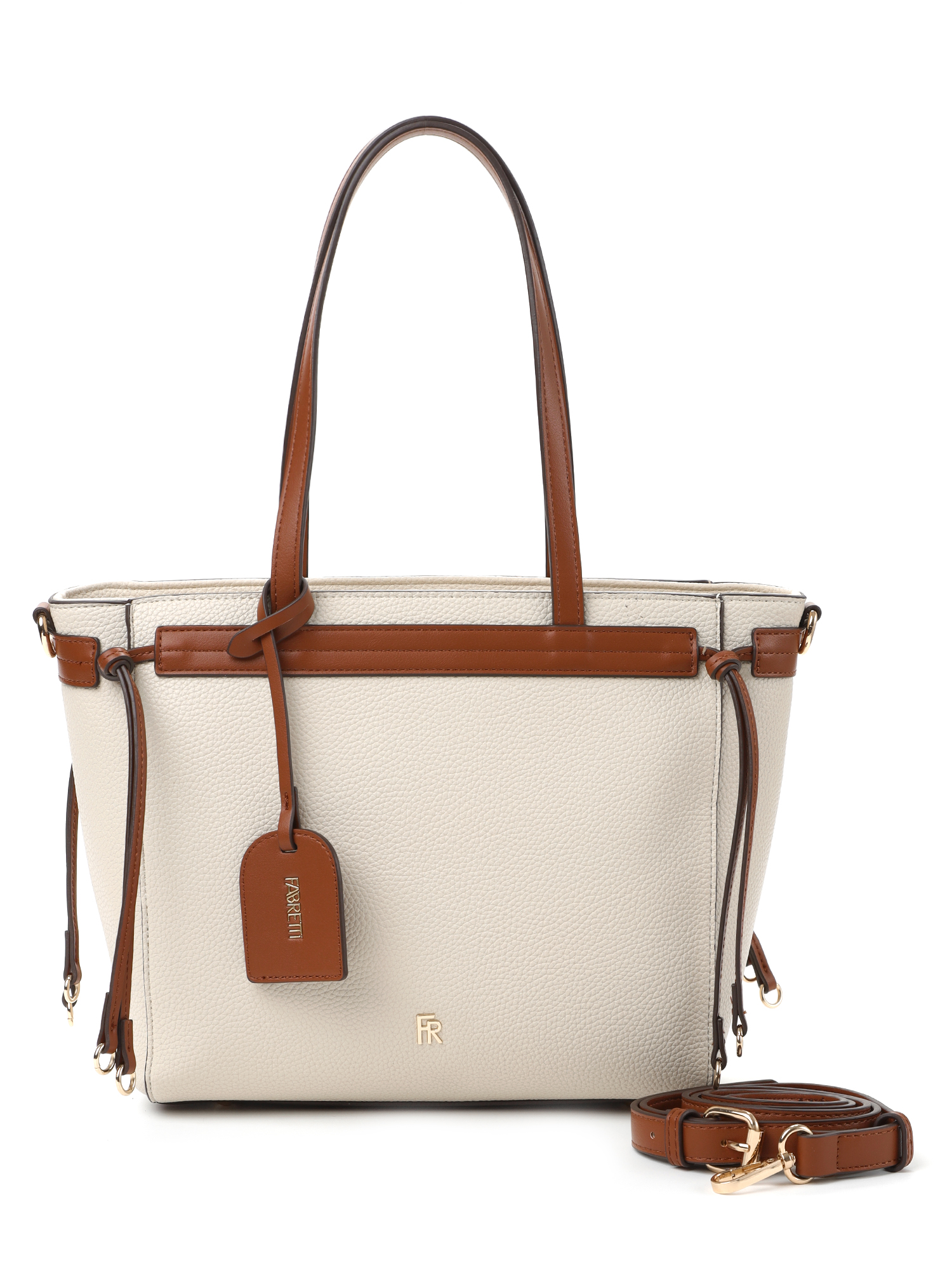 Классическая женская сумка тоут итальянского бренда FABRETTI выполнена из высококачественной экокожи с крупнозернистой фактурой. Модель решена в классической цветовой схеме: светло-бежевая экокожа с рельефом дополнена рыже-коричневой отделкой из гладкой экокожи. Такой вариант смотрится респектабельно, хорошо сочетается с городским и деловым стилем, выглядит эффектно, но не перегружен деталями.