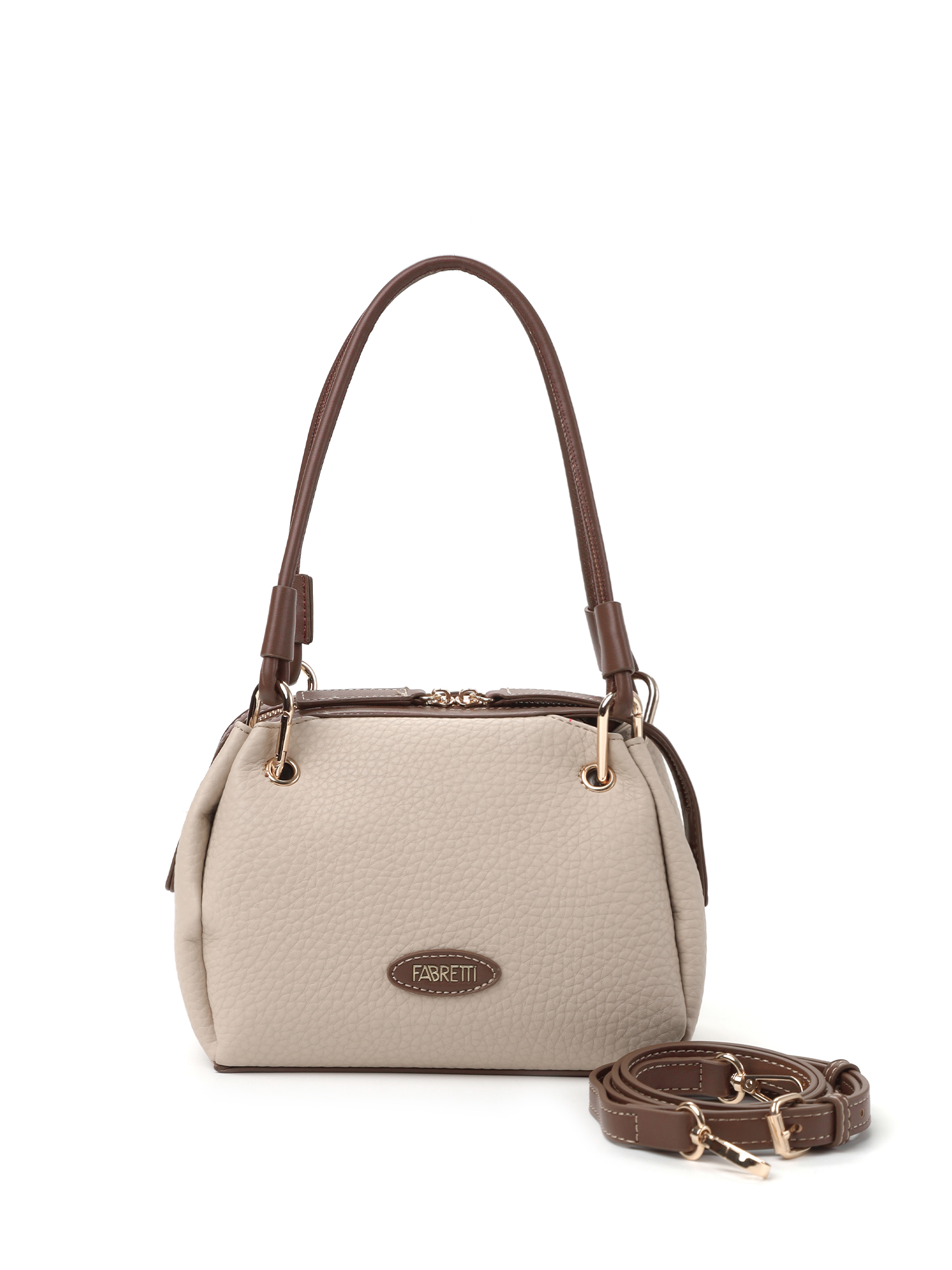 Необычная женская сумка итальянского бренда FABRETTI выполнена из высококачественной экокожи с крупнозернистой фактурой. Модель решена в классической цветовой схеме: бежевая экокожа с рельефом дополнена коричневой отделкой из гладкой экокожи.