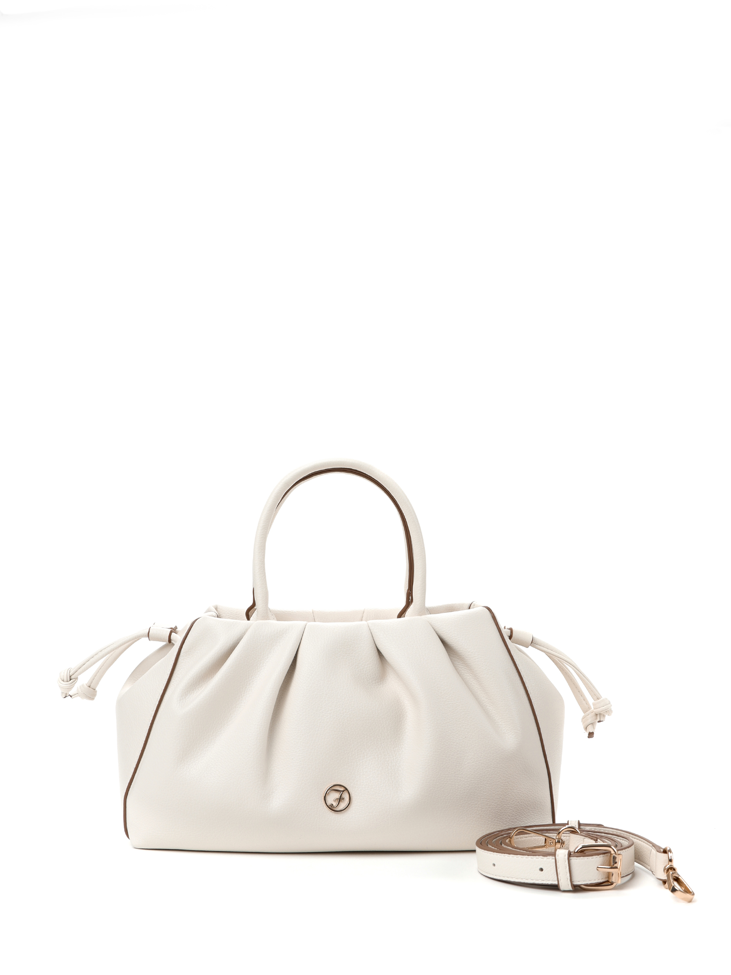 Миниатюрная женская сумка кросс-боди итальянского бренда FABRETTI из нежной мягкой  экокожи с мелкозернистой фактурой в молочно-белом оттенке со светло-коричневой отделкой швов.