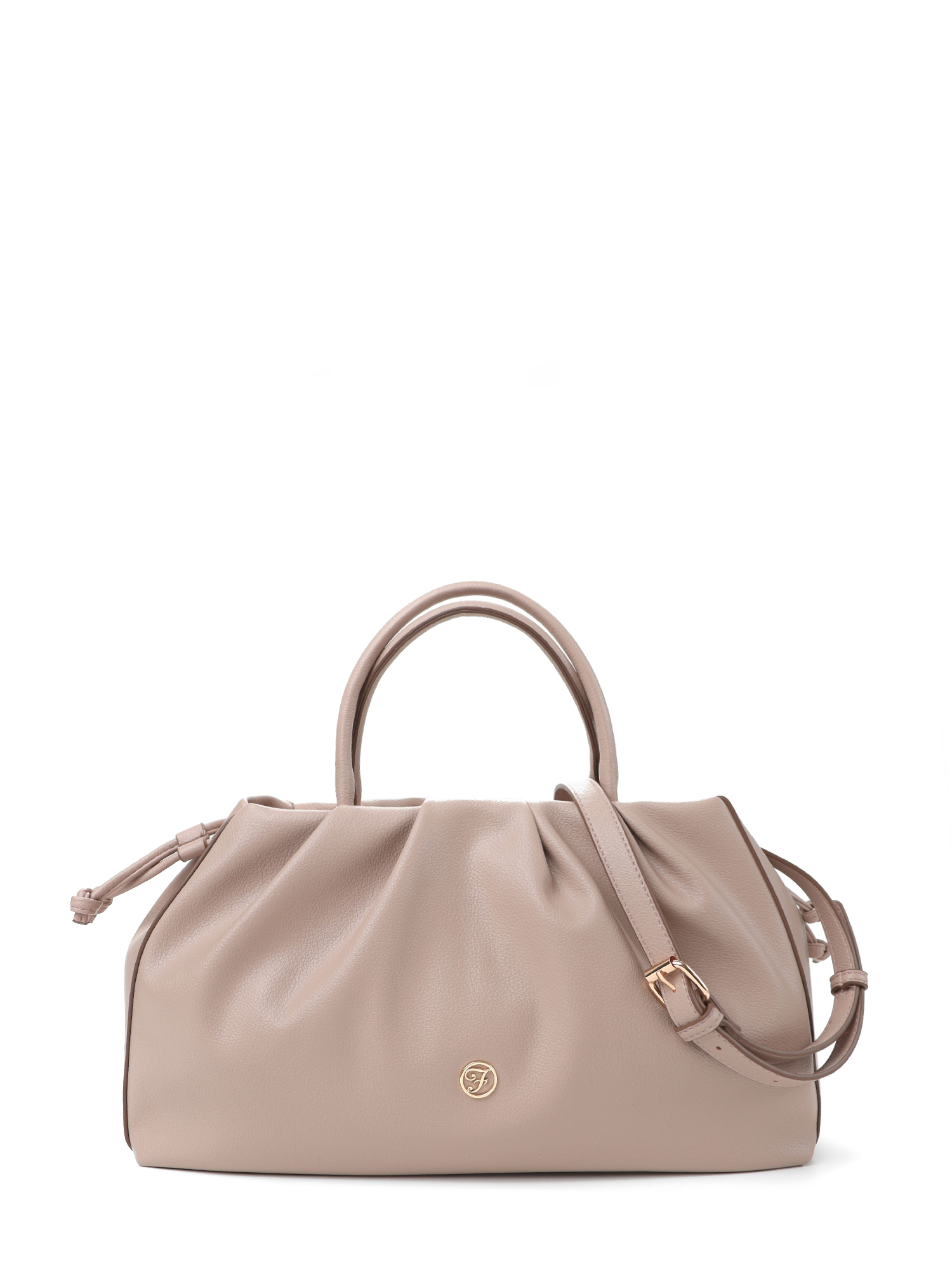 Вместительная женская сумка кросс-боди итальянского бренда FABRETTI из нежной мягкой  экокожи с мелкозернистой фактурой в теплом розово-бежевом «нюдовом» оттенке со светло-коричневой отделкой швов.