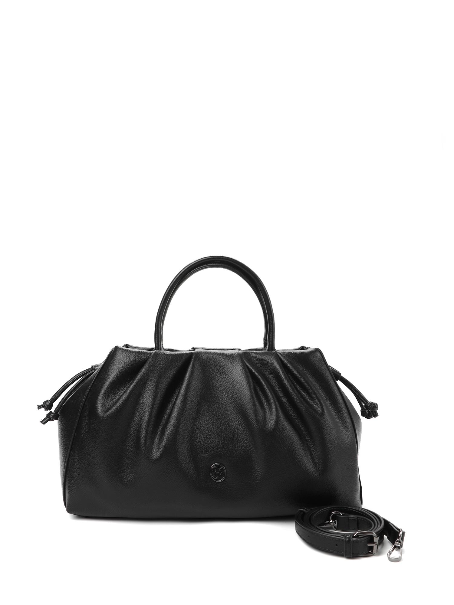 У сумки одно отделение на металлической молнии, внутри три кармана – два открытых и один на молнии. Верх модели оформлен крупными объемными складками, кожаный шнурок позволяет дополнительно утянуть его на манер сумки-кисета. На лицевой стороне изящная металлическая монограмма.