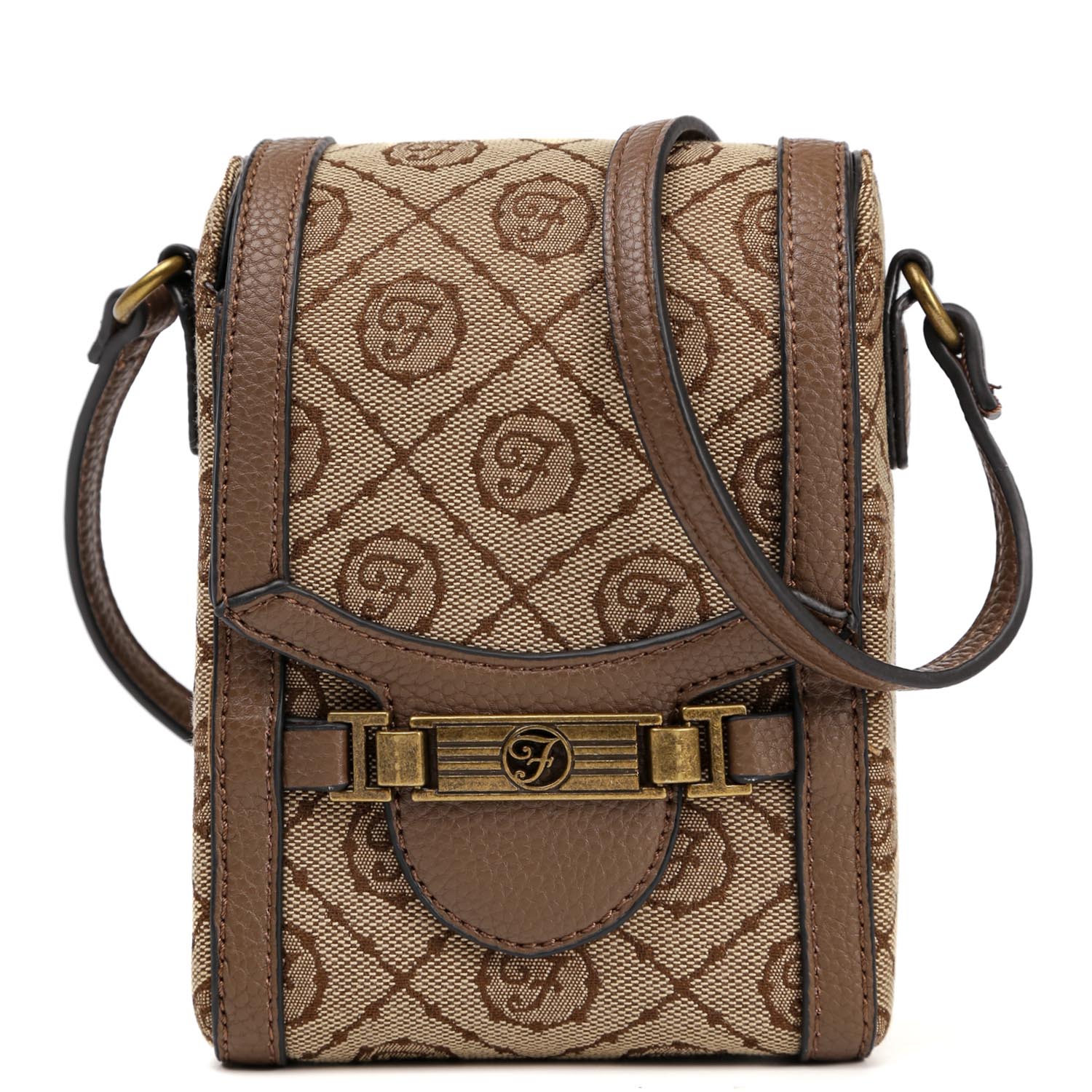 Компактная сумка через плечо FABRETTI в темно-коричневом оттенке декорирована узором в стиле «Логомания». Сумка выполнена из высокотехнологичного полиэстера с фактурой гобелен, устойчивого к воздействию влаги и перепаду температур. Плечевой ремень и детали отделки – из экокожи. Сумка закрывается клапаном на потайной магнитной кнопке. Внутри 3 слота для пластиковых карт. Плечевой ремень регулируется по длине, ширина - 1 см. Цвет фурнитуры – бронза.