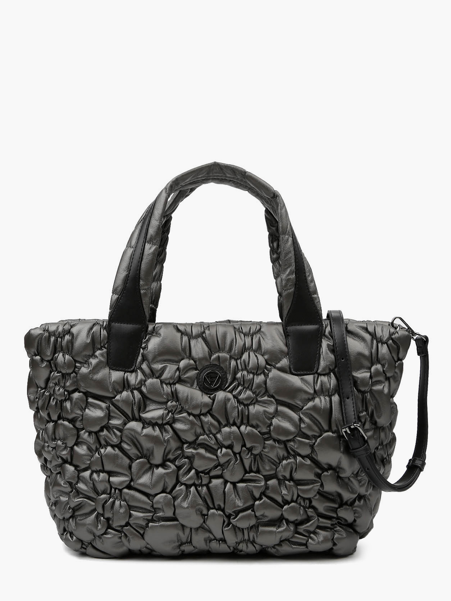 Женская стеганая дутая сумка-тоут среднего размера итальянского бренда FABRETTI выполнена из высокотехнологичного полиэстера, устойчивого к влаге и перепадам температур, в оттенке тёмно-серый металлик с отделкой из экокожи чёрного цвета. Фактура — абстрактная стежка с элементами драпировки. Основное отделение закрывается на молнию. Внутри расположены открытый карман и карман на молнии. Модель оснащена двумя ручками длиной 52 см и съёмным регулируемым ремнём длиной 123–138 см и шириной 1,4 см. Цвет фурнитуры — серебро. Эффектный металлизированный оттенок придаёт модели динамичность и современный характер.