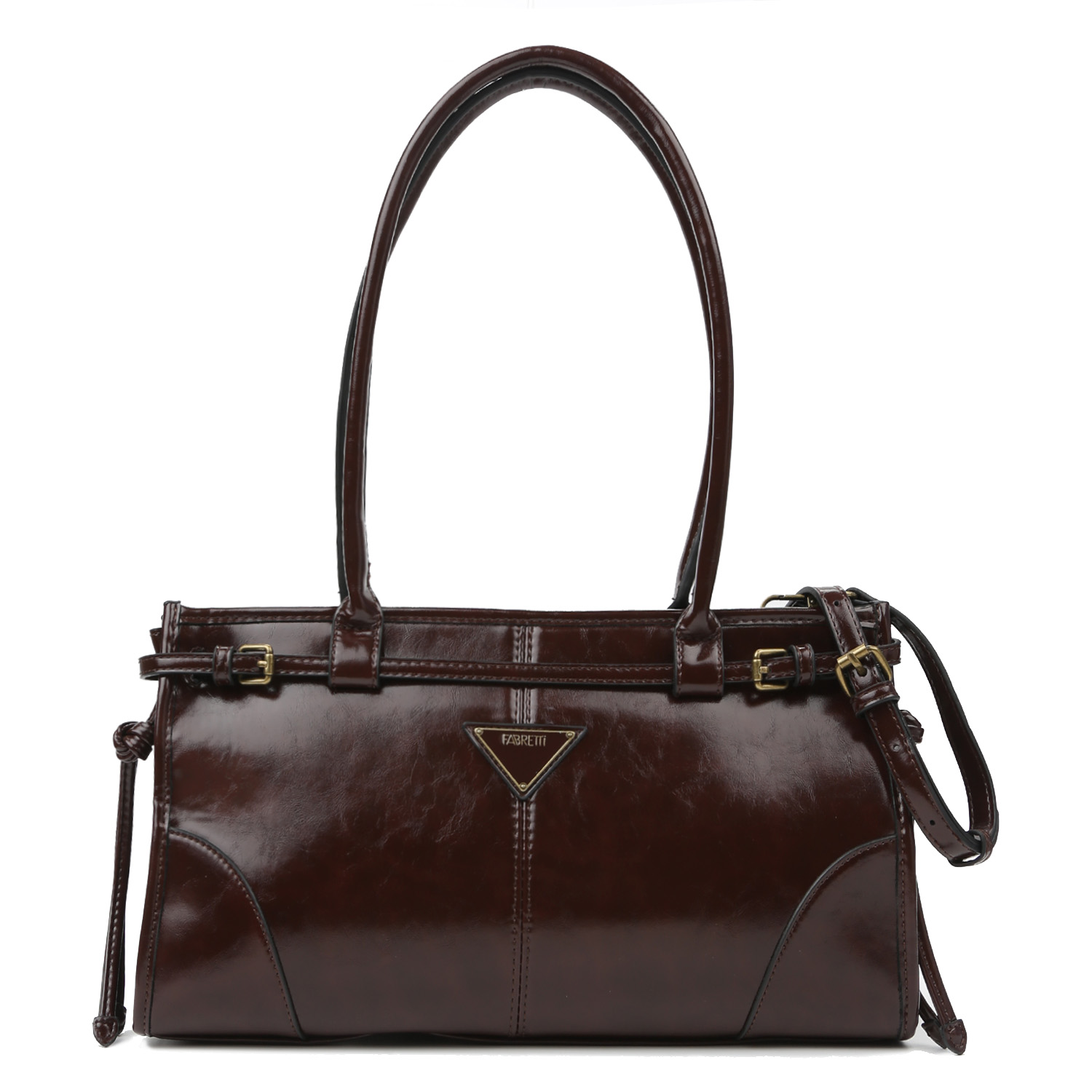 Сумка на плечо итальянского бренда FABRETTI выполнена из экокожи под лакированную кожу темно-коричневого оттенка. Основное отделение закрывается на молнию. Внутри — один открытый карман и один карман на молнии. Снаружи, на тыльной стороне, расположен карман быстрого доступа на молнии. Сумка-тоут укомплектована двумя плечевыми ручками длиной 70 см и съёмным регулируемым ремешком длиной 116–140 см и шириной 1,5 см. Цвет фурнитуры — затертое золото.