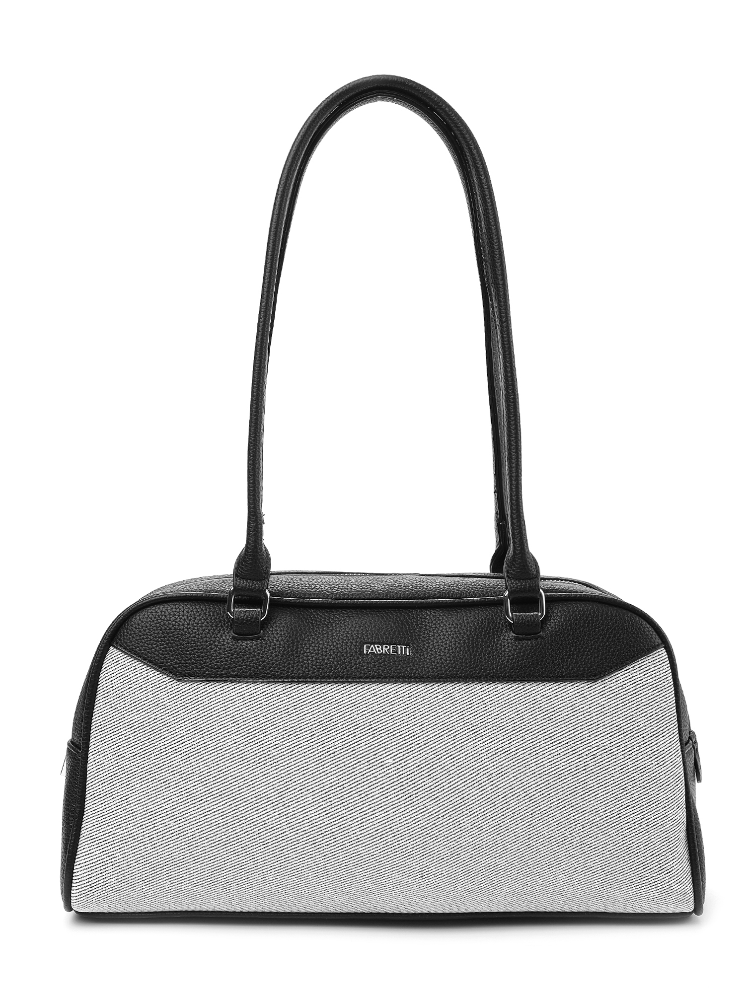 Стильная монохромная сумка боулер от итальянского бренда FABRETTI сочетает высококачественную зернистую экокожу черного цвета и жаккард с узором в тонкую диагональную полоску. Изящная вытянутая и закругленная сверху форма, монохромная отделка и лаконичная серебристая фурнитура делают эту модель невероятно стильной, но сдержанной. Она прекрасно дополнит собой повседневный городской гардероб.