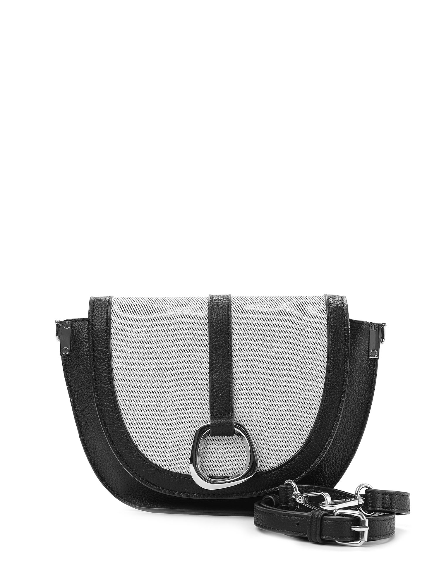 Эффектная женская сумка кросс-боди с клапаном итальянского бренда FABRETTI сочетает высококачественную зернистую экокожу черного цвета и жаккард с узором в тонкую диагональную полоску. Изящная полукруглая форма, монохромная отделка и лаконичная серебристая фурнитура делают эту модель невероятно стильной, но сдержанной. Она прекрасно дополнит собой не только повседневную одежду, но и деловой гардероб.