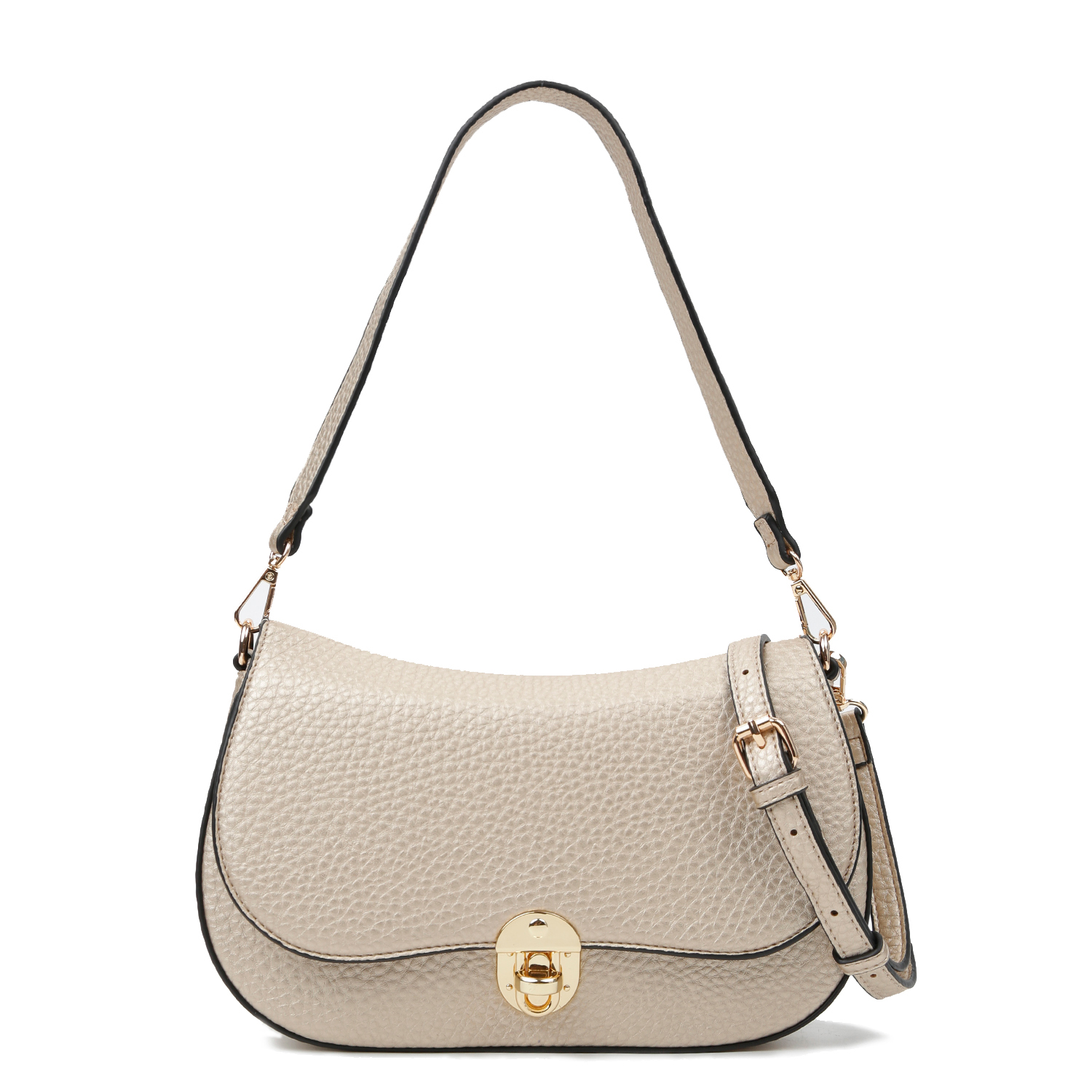 Сумка на плечо итальянского бренда FABRETTI выполнена из экокожи с крупнозернистой фактурой в золотом оттенке. Основное отделение закрывается на молнию и клапан с замком. Внутри расположены открытый карман и карман на молнии. На тыльной стороне — карман быстрого доступа. Модель удобно носить как кросс-боди благодаря съёмному регулируемому ремешку длиной 114–137 см. Сумку также можно носить на плече — у неё короткая несъёмная ручка длиной 57 см. Цвет фурнитуры — золото.