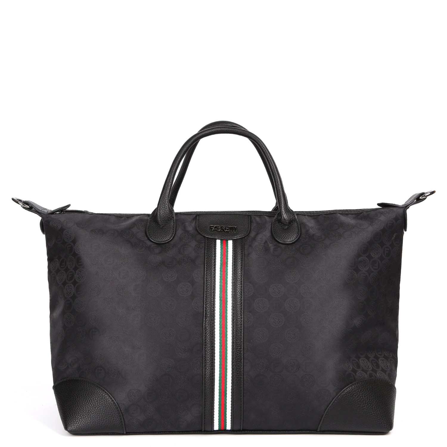 Вместительная дорожная сумка FABRETTI в черном цвете декорирована узором в стиле «Логомания». Сумка выполнена из высокотехнологичного полиэстера с текстурой жаккард, устойчивого к воздействию влаги и перепаду температур. Сумка отлично подойдет для поездки на выходные и вместит самые необходимые вещи для короткого путешествия. Просторное отделение закрывается на молнию. Внутри 3 боковых кармана для мелочей: 2 открытых и на молнии. Лицевая сторона украшена контрастной текстильной лентой. На тыльной стороне расположен карман быстрого доступа на молнии. Ручки, дно и другие элементы отделки выполнены из экокожи. В комплект входит съемный плечевой ремень, длина которого регулируется, ширина - 4 см. Цвет фурнитуры - черненый никель.