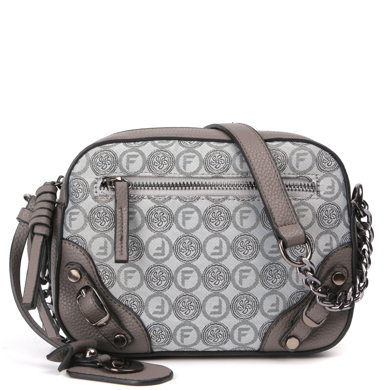 Компактная кросс-боди FABRETTI в сером оттенке декорирована узором в стиле "Логомания". Материал сумки состоит из двух слоев: нижний слой из экокожи, верхний - из жаккарда. Двухслойный материал - это текстильное волокно, дублированное с высококачественным полиуретаном посредством термической обработки. Основное отделение закрывается на полукруглую молнию. Внутри 2 боковых кармана для мелочей: открытый и на молнии. На лицевой стороне расположен карман быстрого доступа на молнии. Дно сумки защищают 4 металлические ножки. Плечевой ремень регулируется по длине и сочетает экокожу со вставками из металлической цепочки, ширина - 2 см. Цвет фурнитуры - черненый никель.
