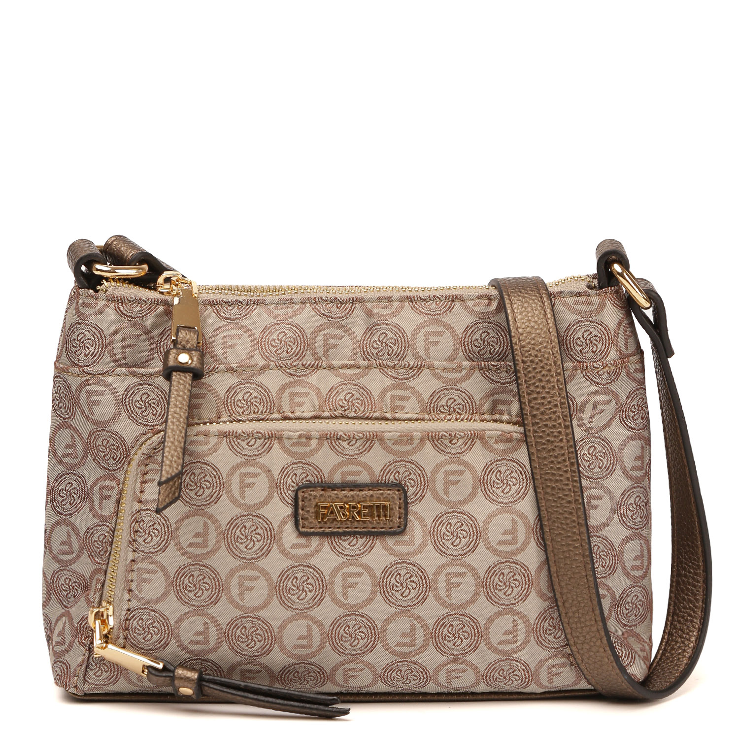 Компактная кросс-боди FABRETTI в бежевом оттенке декорирована узором в стиле "Логомания". Двухслойный материал сумки - это текстильное волокно с фактурой жаккард, дублированное с высококачественным полиуретаном посредством термической обработки. Основное отделение закрывается на молнию. Внутри 2 боковых кармана для мелочей: открытый и на молнии. На лицевой стороне расположен вместительный накладной карман на полукруглой молнии и карман на магнитной кнопке. На тыльной стороне есть 2 открытых кармана быстрого доступа. Плечевой ремень регулируется по длине, ширина - 2 см. Цвет фурнитуры - золото.