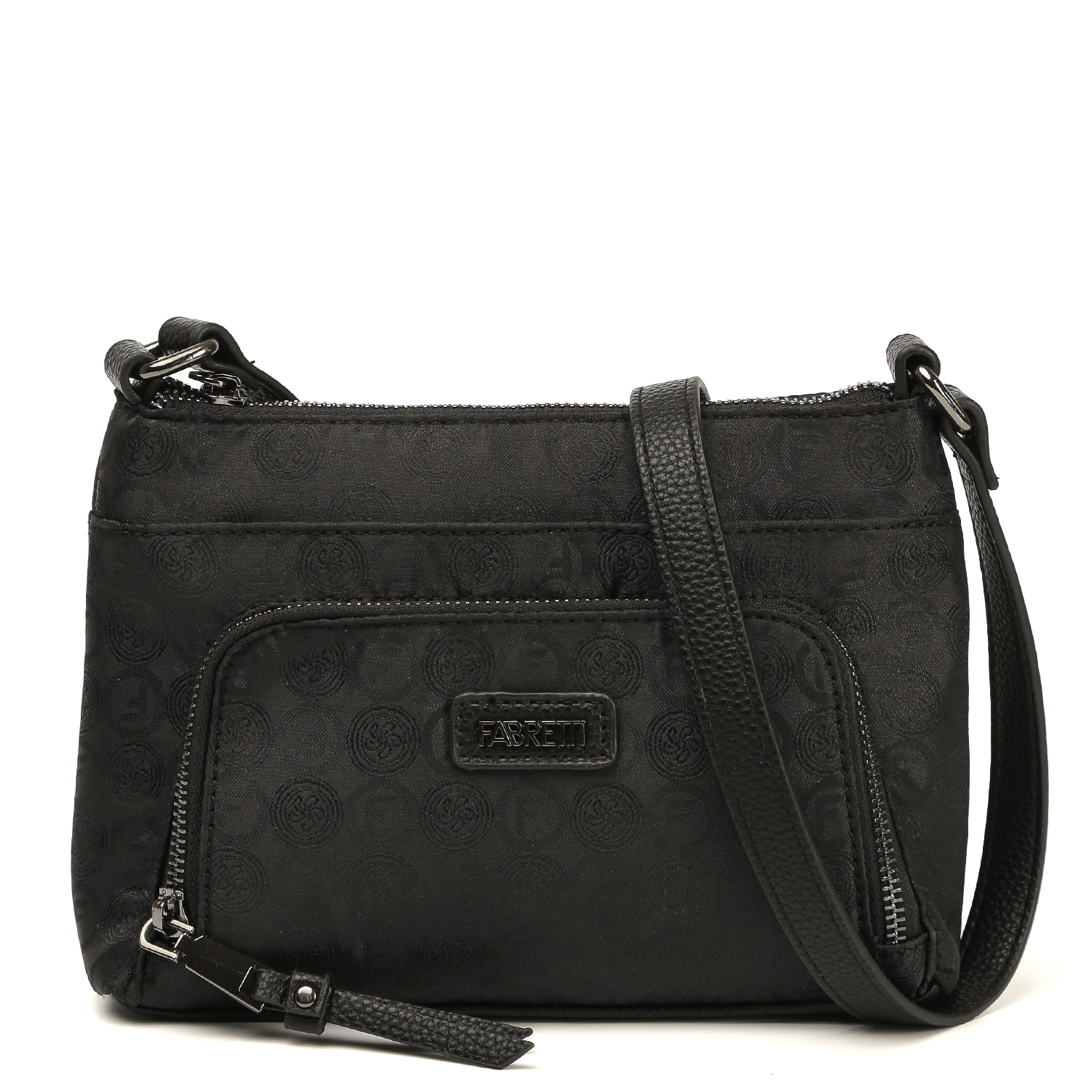 Компактная кросс-боди FABRETTI в черном цвете декорирована узором в стиле "Логомания". Двухслойный материал сумки - это текстильное волокно с фактурой жаккард, дублированное с высококачественным полиуретаном посредством термической обработки. Основное отделение закрывается на молнию. Внутри 2 боковых кармана для мелочей: открытый и на молнии. На лицевой стороне расположен вместительный накладной карман на полукруглой молнии и карман на магнитной кнопке. На тыльной стороне есть 2 открытых кармана быстрого доступа. Плечевой ремень регулируется по длине, ширина - 2 см. Цвет фурнитуры - черненый никель.