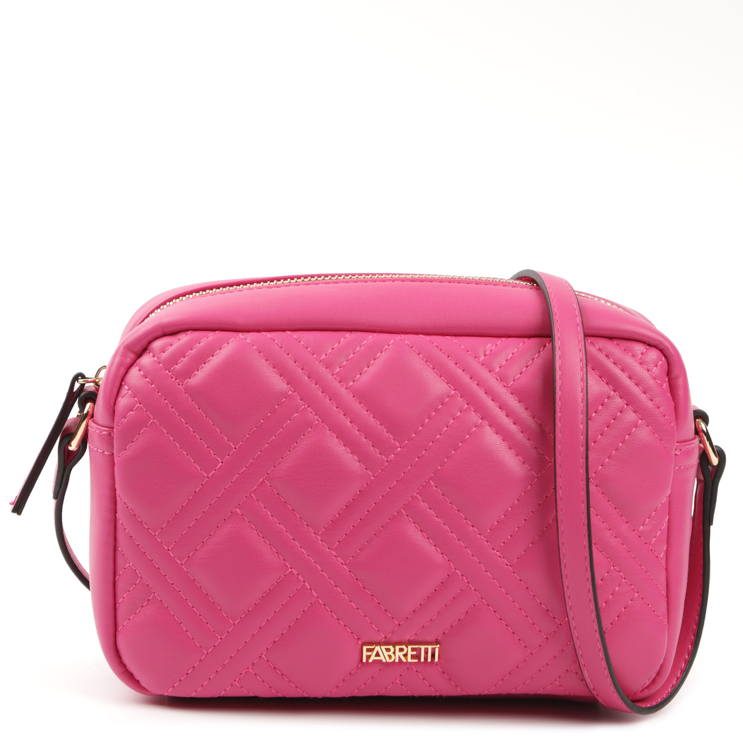 Стильная кросс-боди мягкой формы FABRETTI выполнена из экокожи в насыщенном оттенке фуксии и декорирована геометрической стёжкой. Основное отделение закрывается на полукруглую молнию с удобным поводком. Внутри 2 боковых кармана для мелочей: открытый и на молнии. На тыльной стороне предусмотрен карман быстрого доступа на молнии. Плечевой ремень регулируется по длине, ширина - 1 см. Цвет фурнитуры - золото.