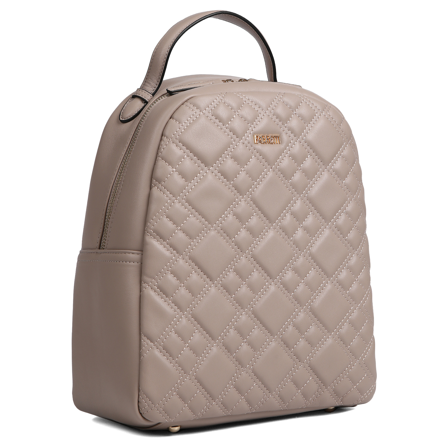 Вместительный рюкзак FABRETTI в бежевом цвете выполнен из экокожи приятной мягкой фактуры. Основное отделение закрывается на молнию с 2 бегунками. Внутри расположены 3 боковых кармана: 2 открытых и 1 на молнии. На тыльной стороне предусмотрен вертикальный карман быстрого доступа, закрывающийся на молнию с удобным поводком. Лицевая сторона декорирована геометрической стёжкой и металлическим шильдиком с логотипом бренда. Лямки средней ширины регулируются по длине. Сверху есть удобная ручка, которая позволяет носить аксессуар в руке. Фурнитура под золото гармонично дополняет дизайн изделия.