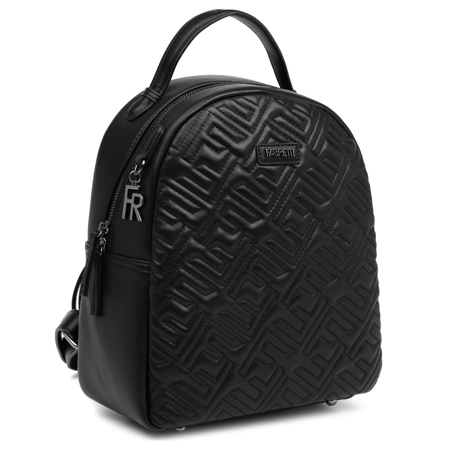 Вместительный рюкзак FABRETTI в черном цвете выполнен из экокожи приятной мягкой фактуры. Основное отделение закрывается на молнию с 2 бегунками. Внутри расположены 3 боковых кармана: 2 открытых и 1 на молнии. На тыльной стороне предусмотрен вертикальный карман быстрого доступа, закрывающийся на молнию с удобным поводком. Лицевая сторона декорирована стёжкой, элементы которой повторяют монограмму бренда. Лямки средней ширины регулируются по длине. Сверху есть удобная ручка, которая позволяет носить аксессуар в руке. Цвет фурнитуры – черненый никель.