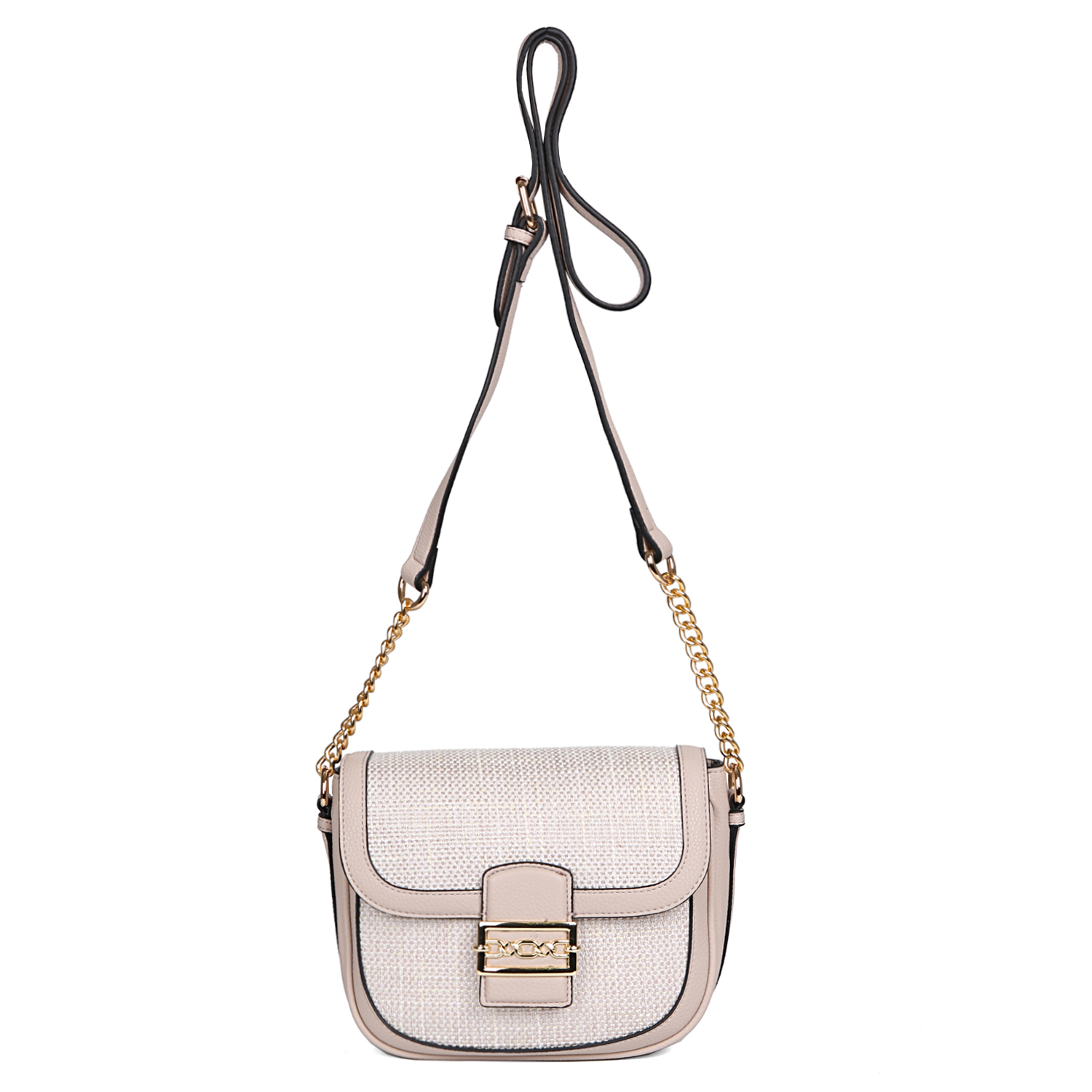 Стильная сумка кросс-боди FABRETTI выполнена из экокожи в бежевом цвете и декорирована текстильными вставками в том же тоне. Сумка закрывается на клапан с магнитной кнопкой. В качестве декора выступает крупная металлическая пряжка. Внутри 2 боковых кармана для мелочей: открытый и на молнии. Несъемный плечевой ремень скомбинирован с металлическими цепочками, длина ремня регулируется. Фурнитура под золото гармонично дополняет дизайн изделия.