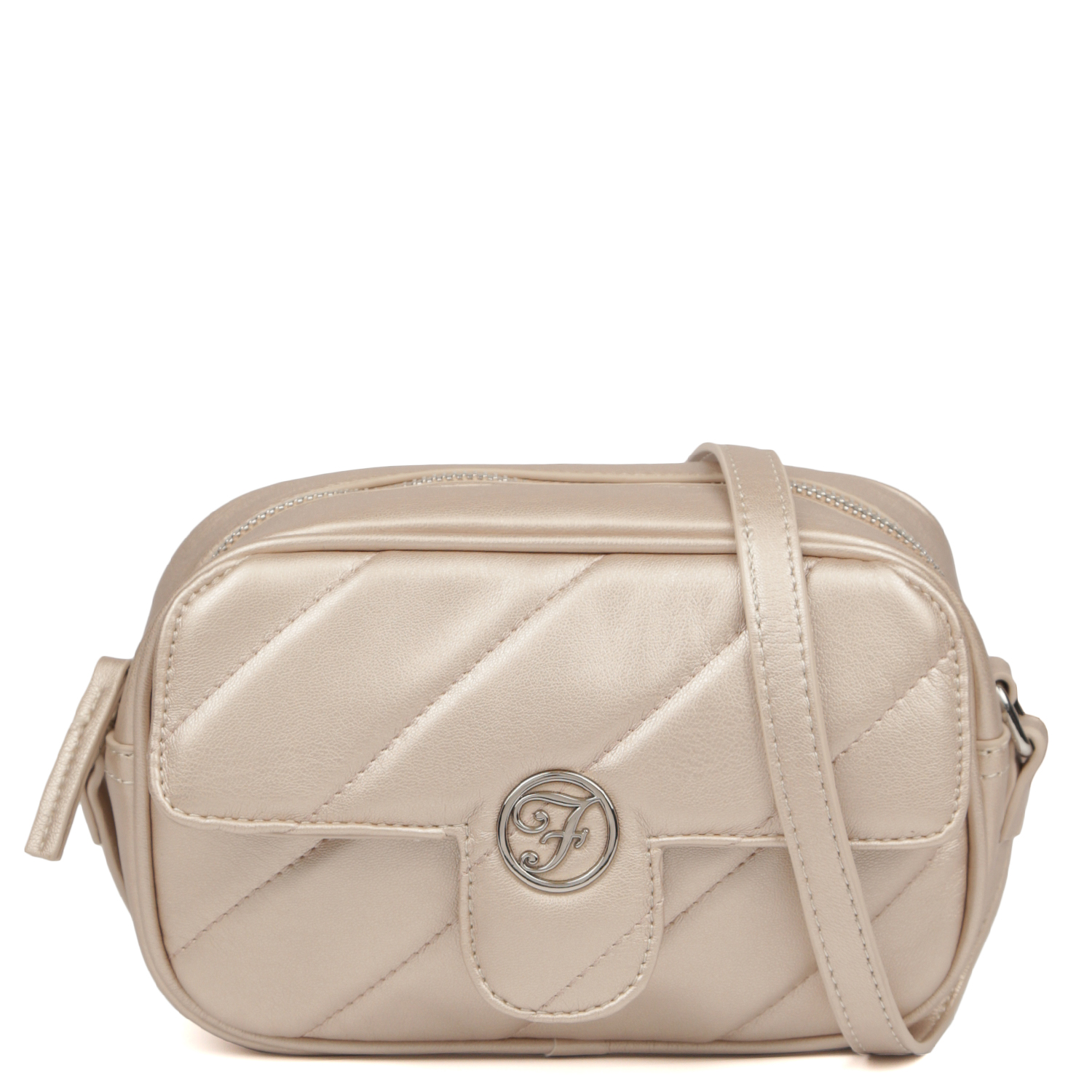 Стильная кросс-боди FABRETTI выполнена из стёганой экокожи жемчужного цвета. Вместительное отделение закрывается на молнию с удобным поводком. Внутри 2 боковых кармана для мелочей: открытый и на молнии. На лицевой стороне расположен карман быстрого доступа, который закрывается клапаном с магнитной кнопкой и декорирован монограммой бренда. Плечевой ремень регулируется по длине.