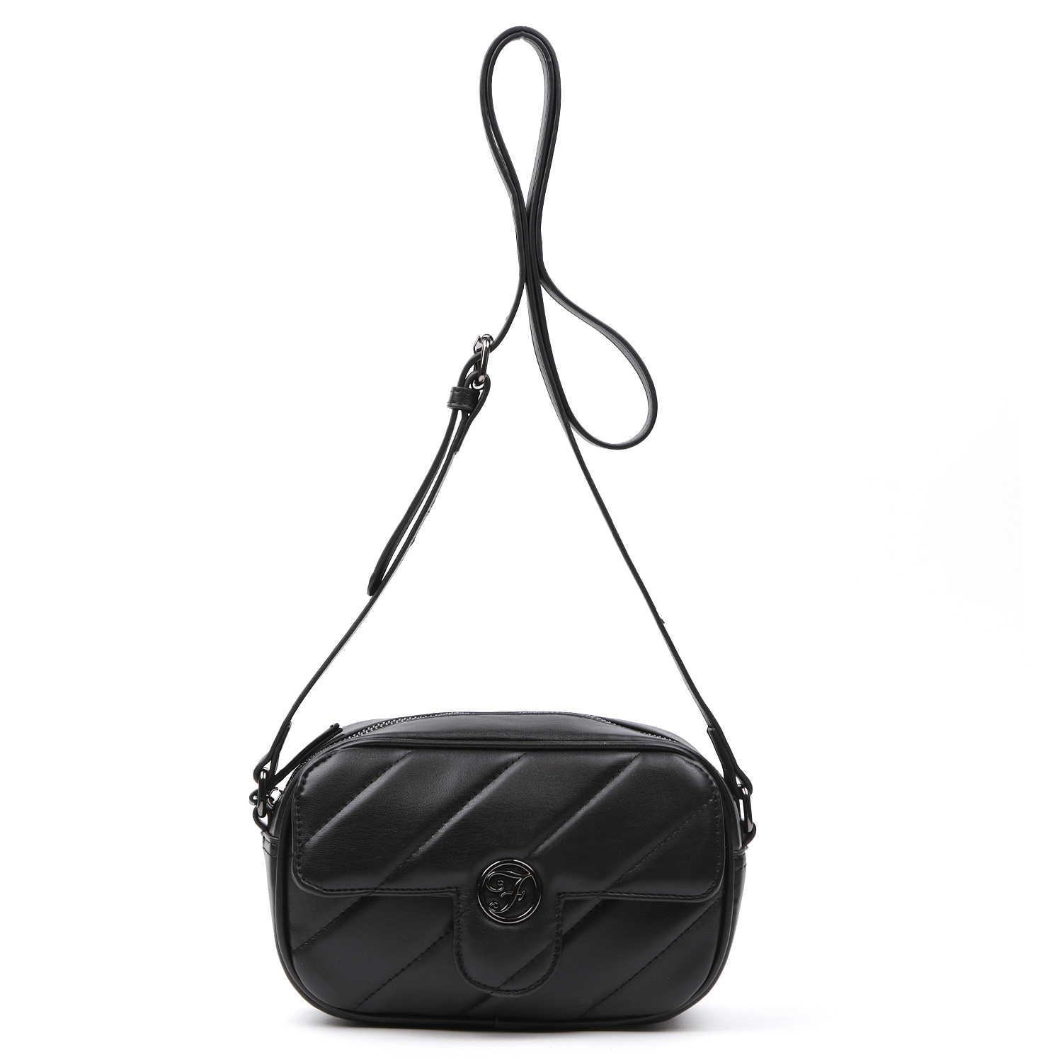 Стильная кросс-боди FABRETTI выполнена из стёганой экокожи черного цвета. Вместительное отделение закрывается на молнию с удобным поводком. Внутри 2 боковых кармана для мелочей: открытый и на молнии. На лицевой стороне расположен карман быстрого доступа, который закрывается клапаном с магнитной кнопкой и декорирован монограммой бренда. Плечевой ремень регулируется по длине.